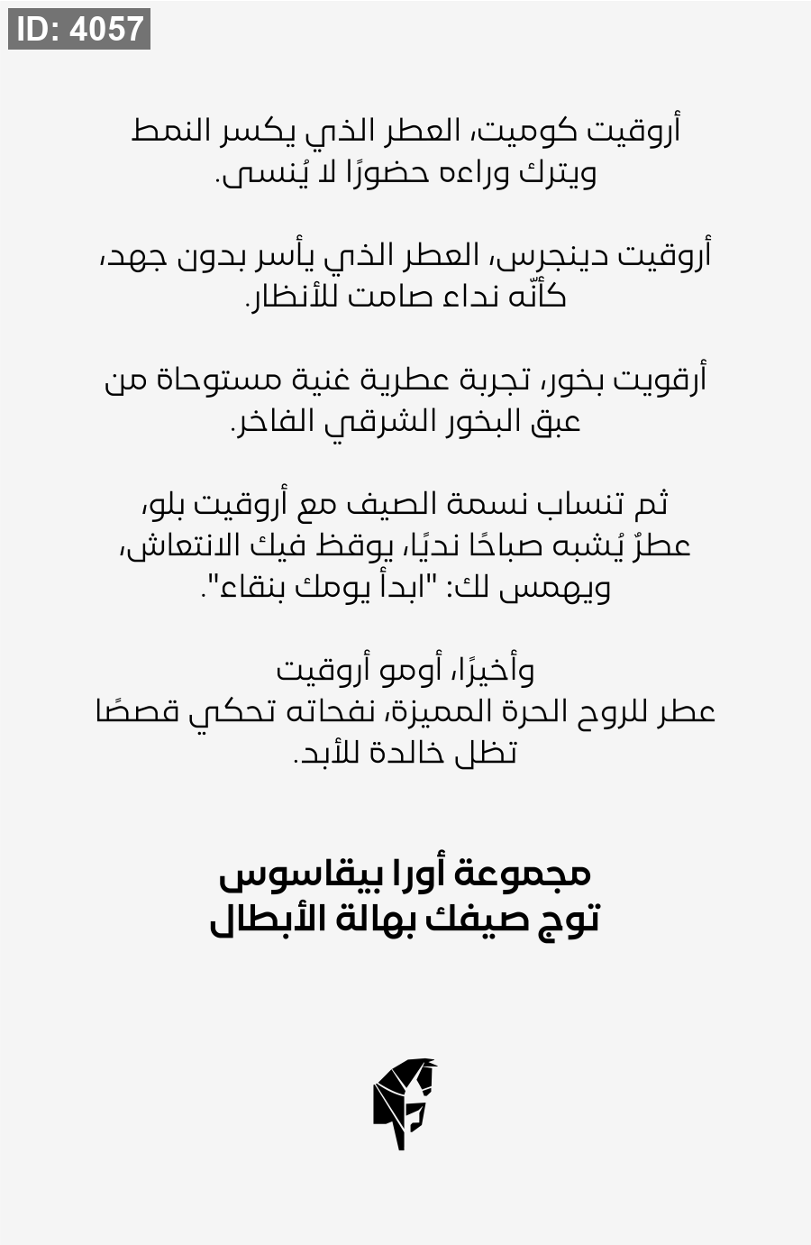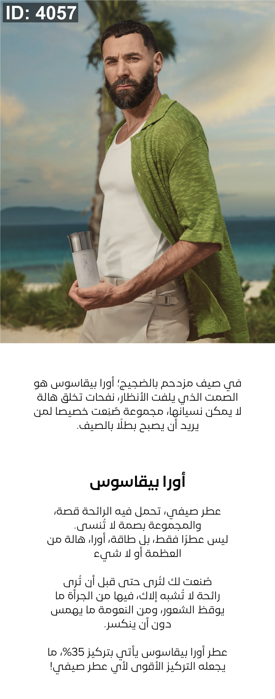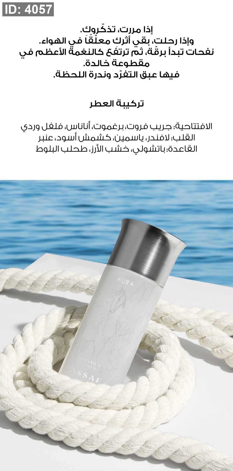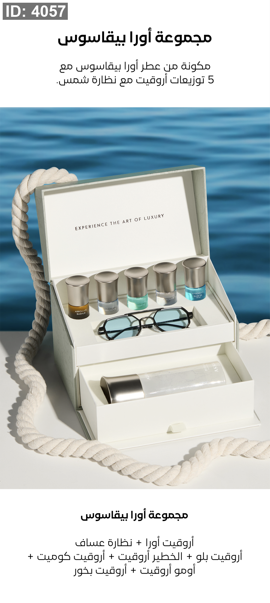في صيف مزدحم بالضجيج؛ أورا بيقاسوس هو الصمت الذي يلفت الأنظار، نفحات تخلق هالة لا يمكن نسيانها، مجموعة صُنِعت خصيصا لمن يريد أن يصبح بطلا بالصيف.