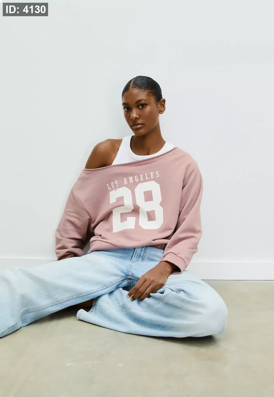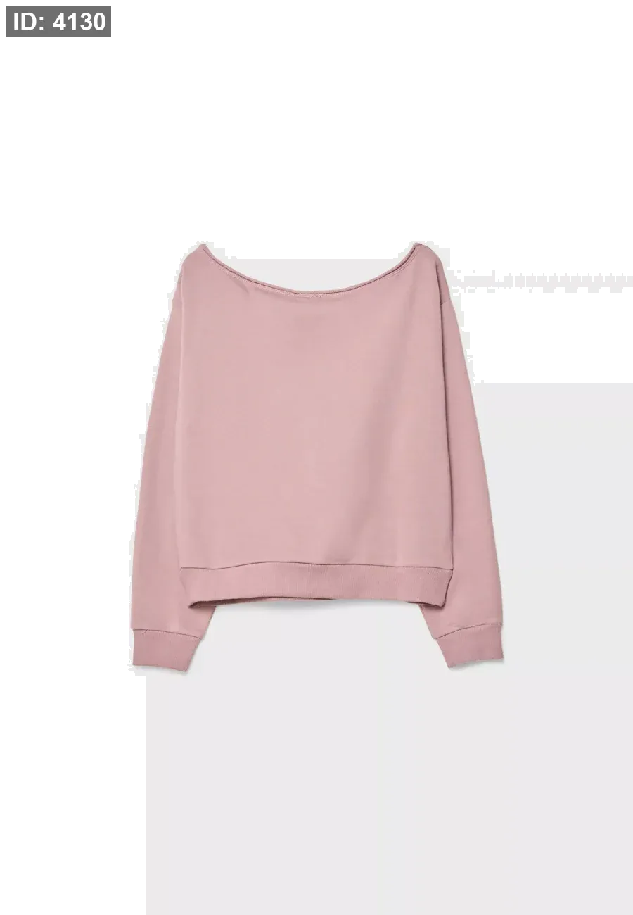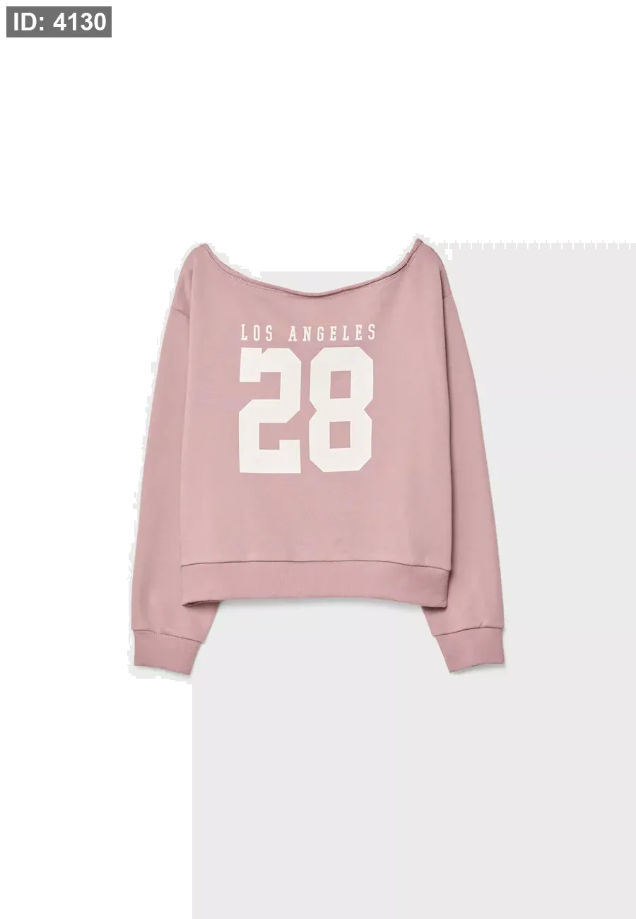 Boat neck sweatshirt with long sleeves and exposed shoulders. Print detail on the front. Ribbed trims. Available in several colours.