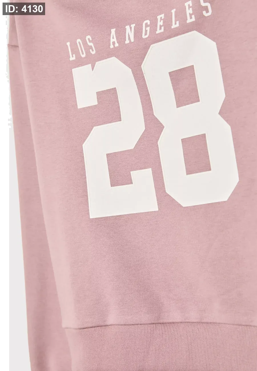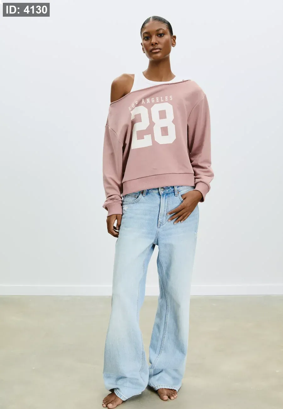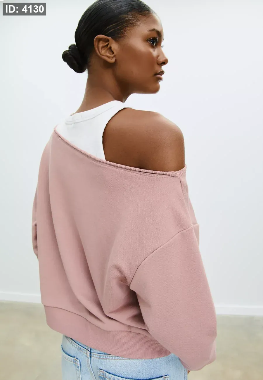 Boat neck sweatshirt with long sleeves and exposed shoulders. Print detail on the front. Ribbed trims. Available in several colours.