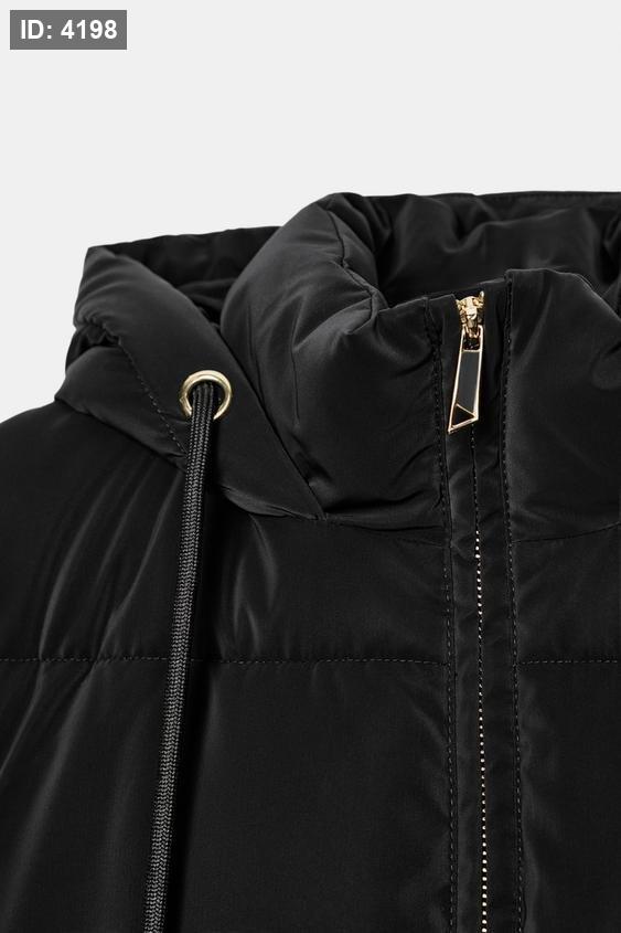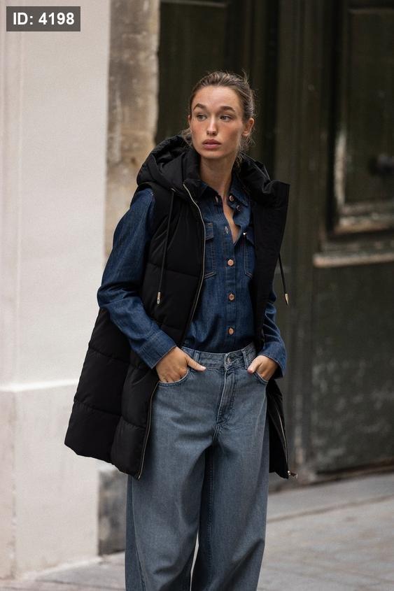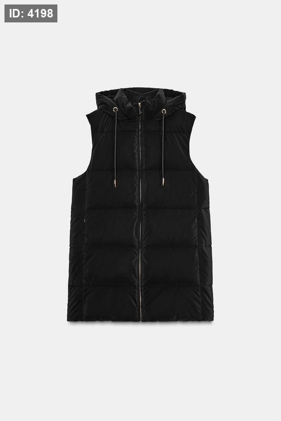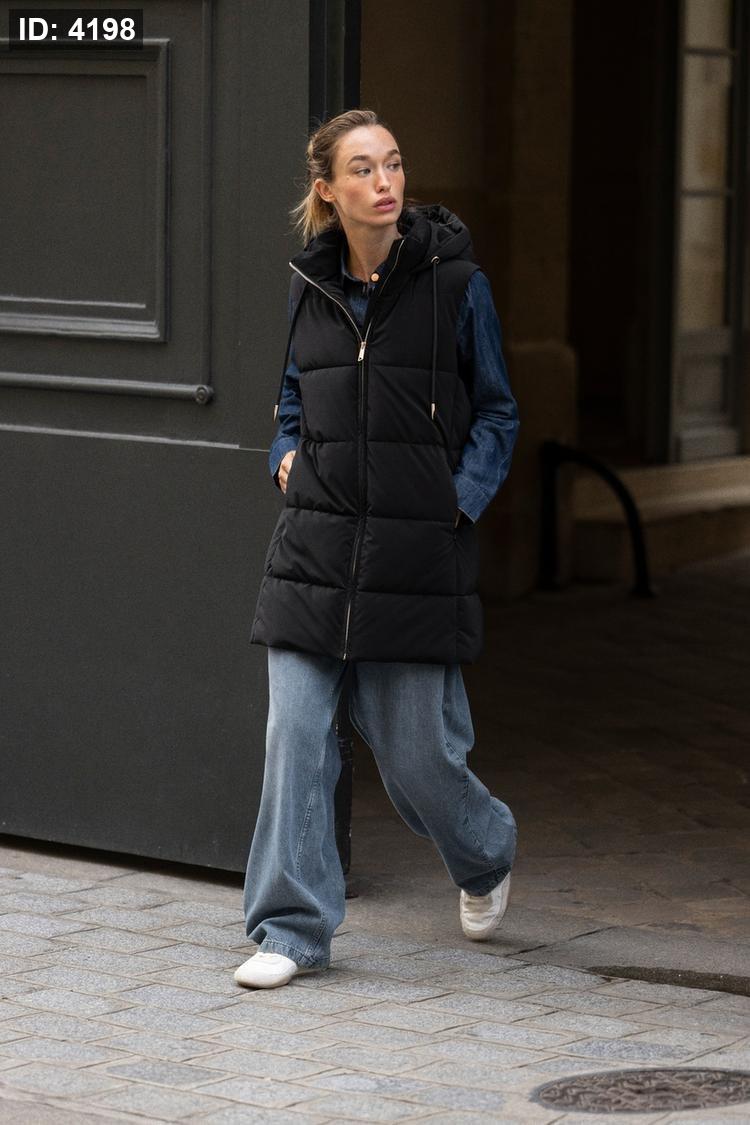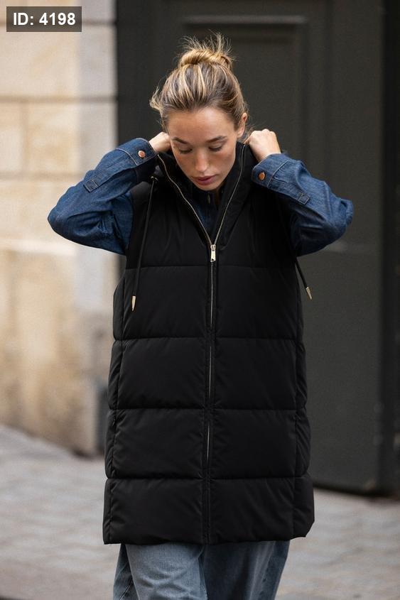 Longline gilet with a high neck and adjustable drawstring hoodie, featuring sleeveless design. Front zip pockets concealed in the seam with fleece lining. Zip-up front fastening.