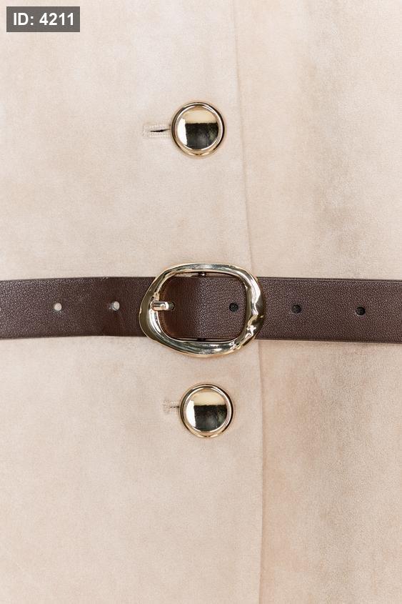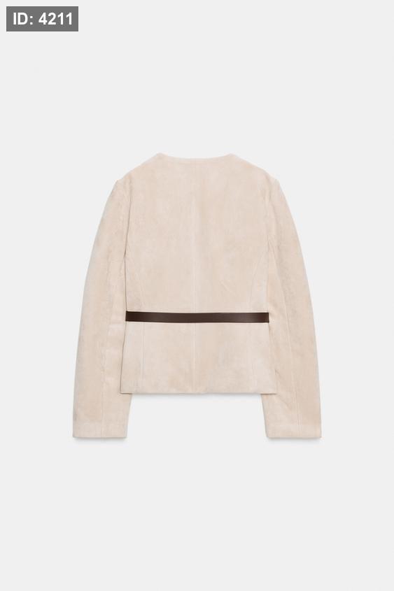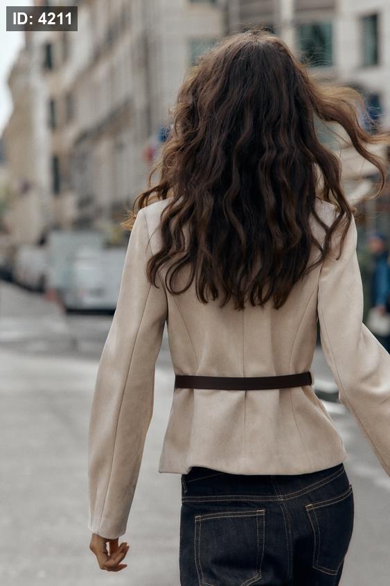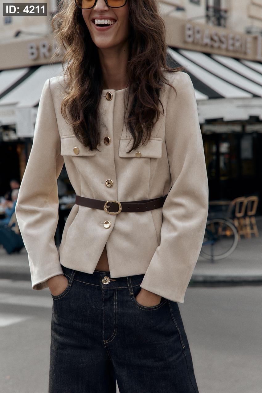 Round neck, long sleeve blazer. Featuring front flaps and a belt. Front pockets. Button fastening on the front.
