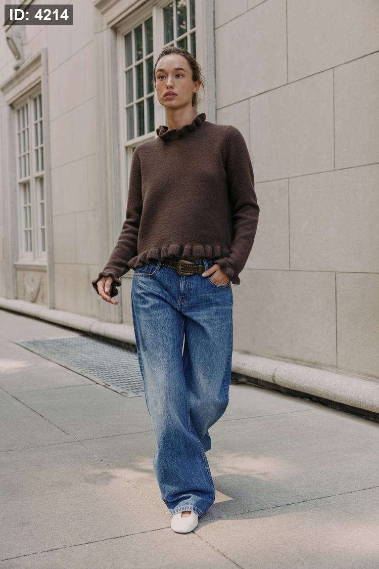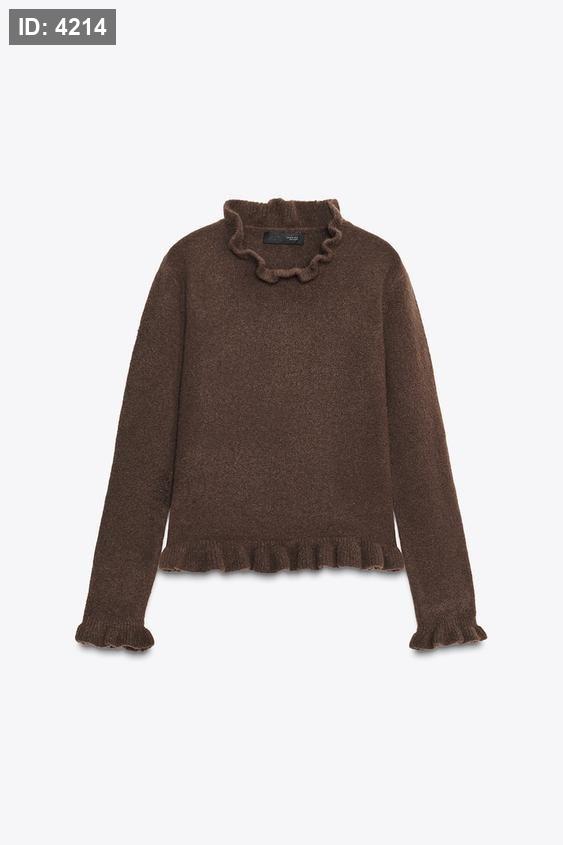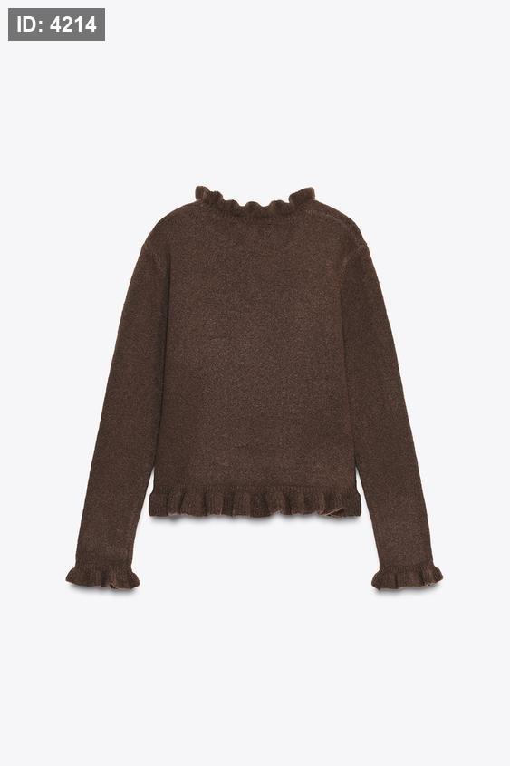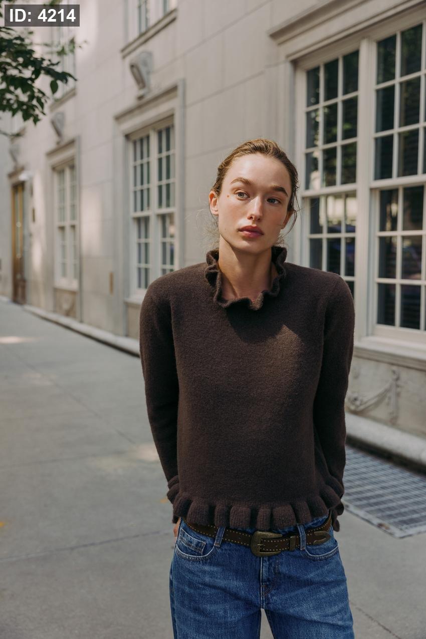 Plain knit sweater with a round neck and long sleeves. Featuring ruffle trim.