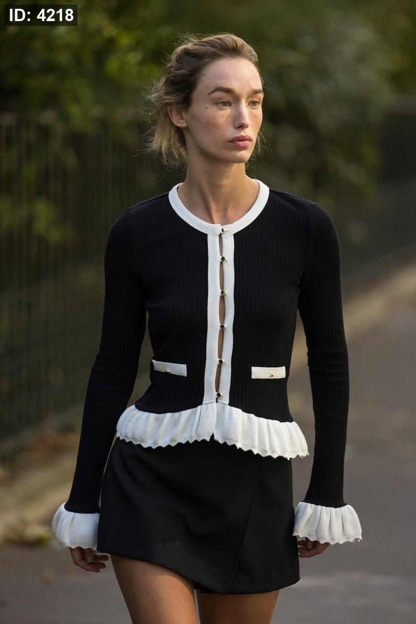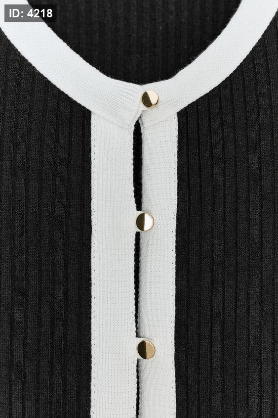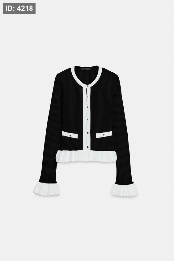 Round neck, long sleeve jacket. Featuring mock front pockets, contrast trims and a button-up front.