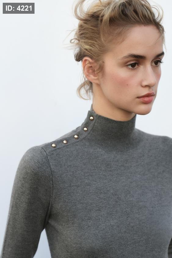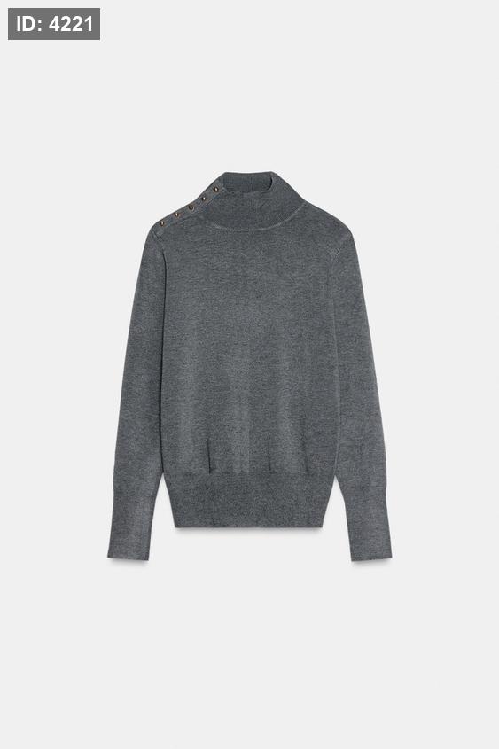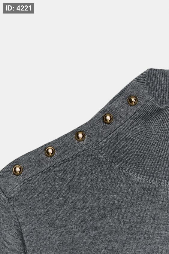 Plain knit jumper with a high neck and long sleeves. Features gold-toned button detailing on the shoulder.