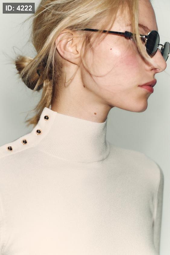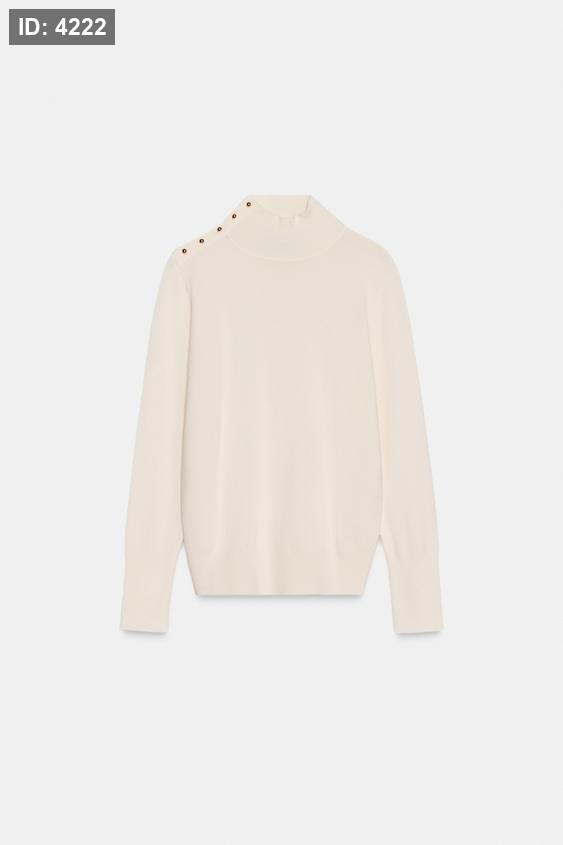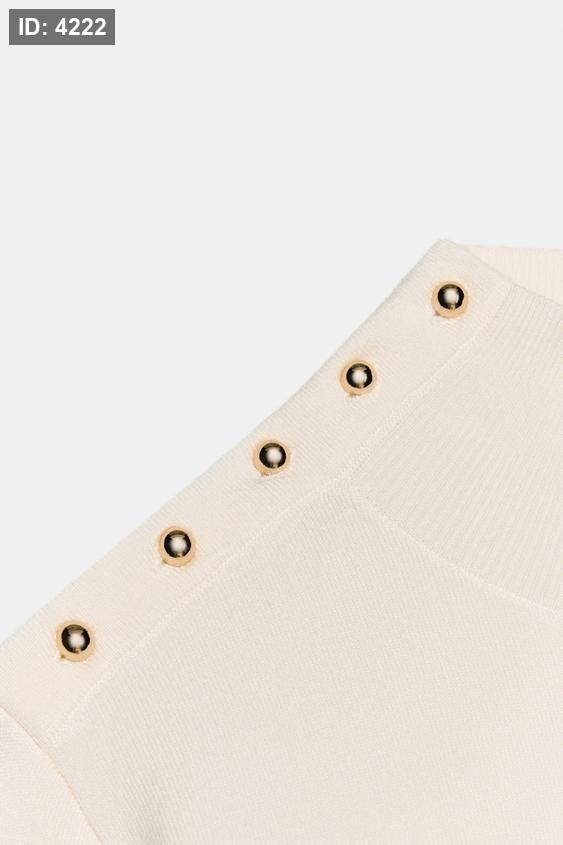 Plain knit jumper with a high neck and long sleeves. Features gold-toned button detailing on the shoulder.