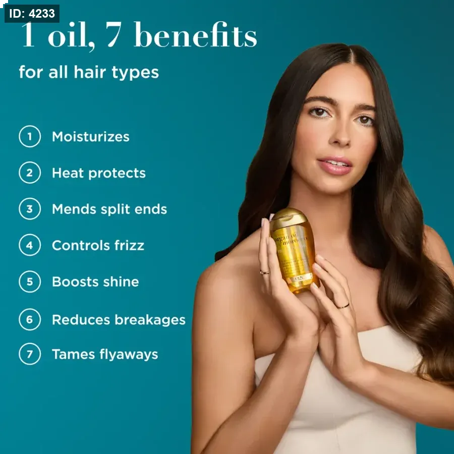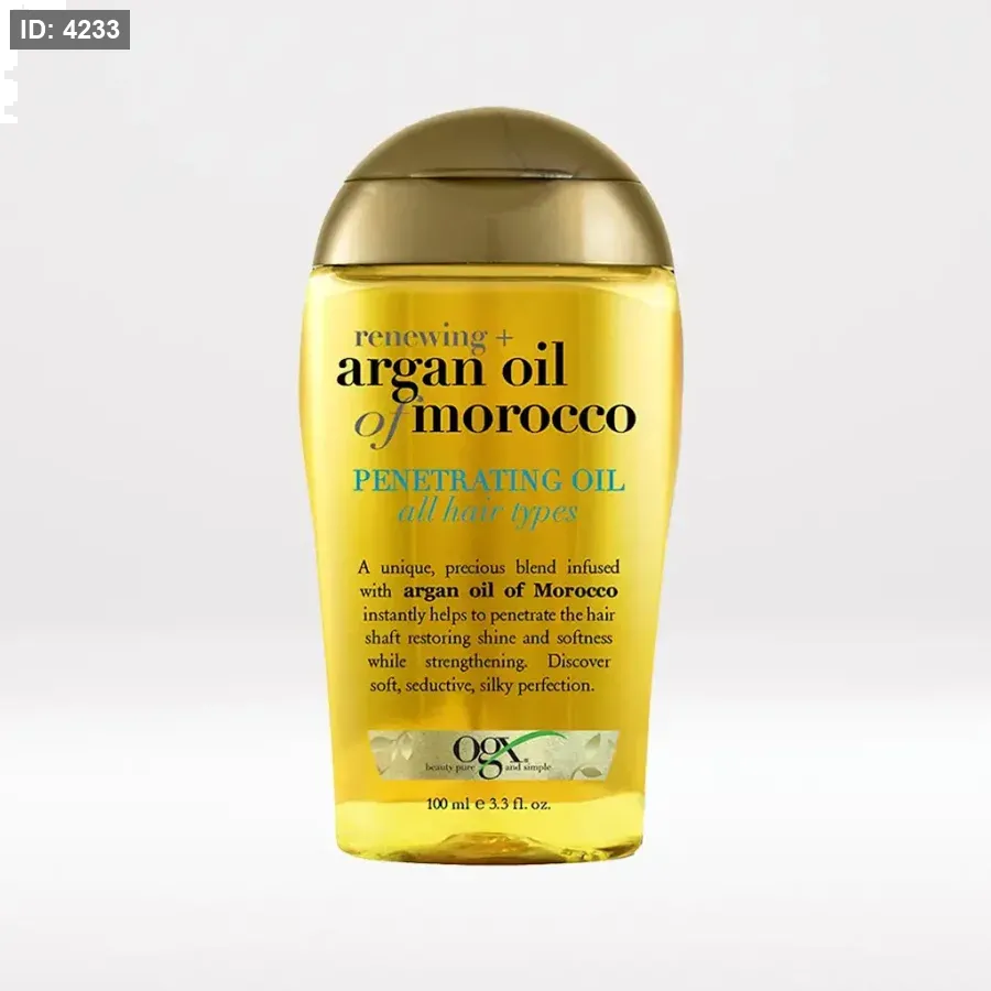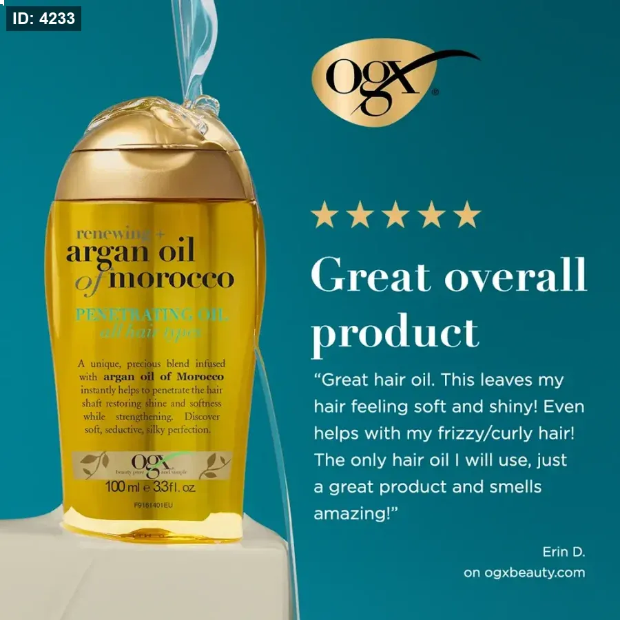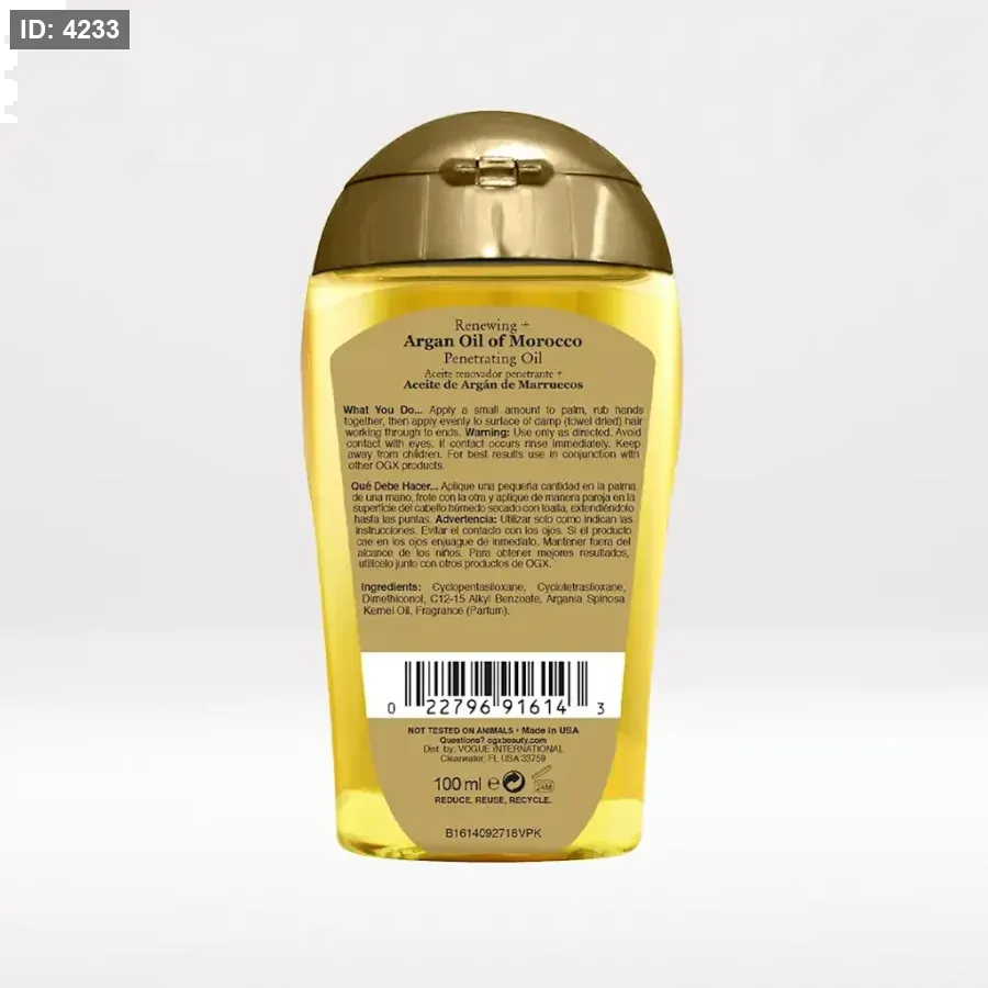 Strengthen and renew hair with OGX Argan Oil of Morocco Penetrating Hair Oil Treatment. Ideal for all hair types and textures, the rich hair oil helps penetrate the hair shaft while renewing and softening hair. Formulated with a hydrating blend of rich cold-pressed Moroccan argan oil, it helps revive hair to leave it nourished and silky smooth. Nourishing hair oil seals in nutrients and shine to help improve hair strength and elasticity, leaving you with touchable tresses that are soft but strong. Plus, the citrus-fresh, floral-green and woody scent makes hair care an all-around sensory experience and leaves locks with an irresistibly good smell. Paraben and sulfated-surfactants free, this hair oil is gentle enough to give locks a radiant shine from the inside out. For a full hair care routine that’ll leave your hair lush and divinely shiny, pair with Renewing + Argan Oil of Morocco Shampoo and Conditioner and other OGX Moroccan oil hair products.