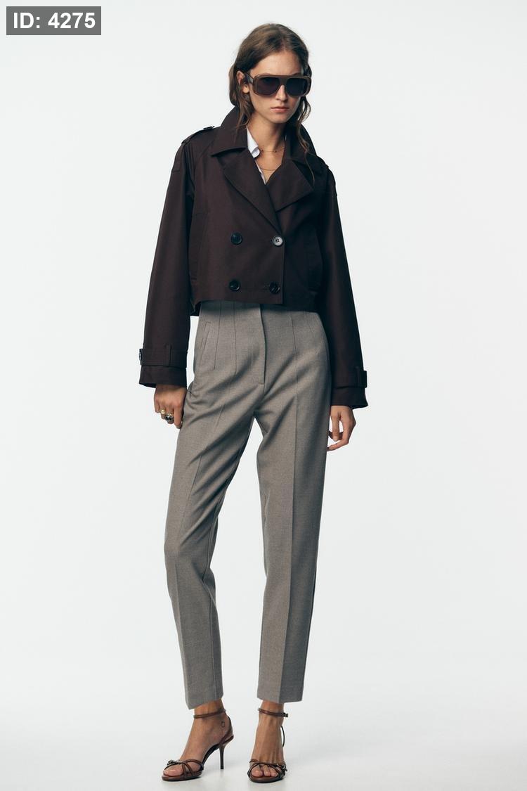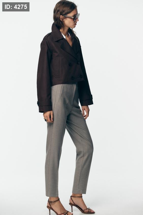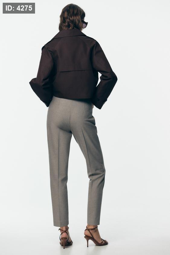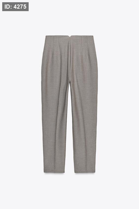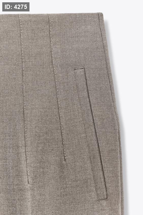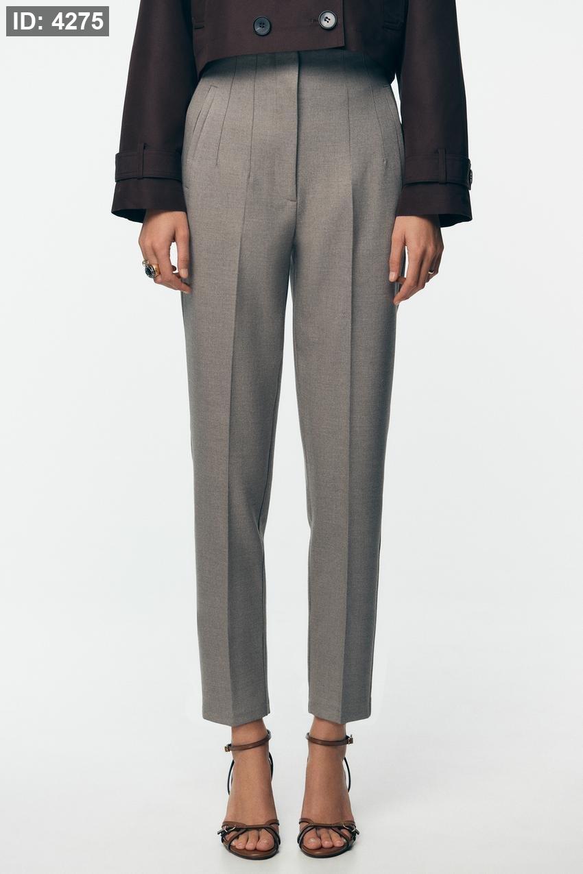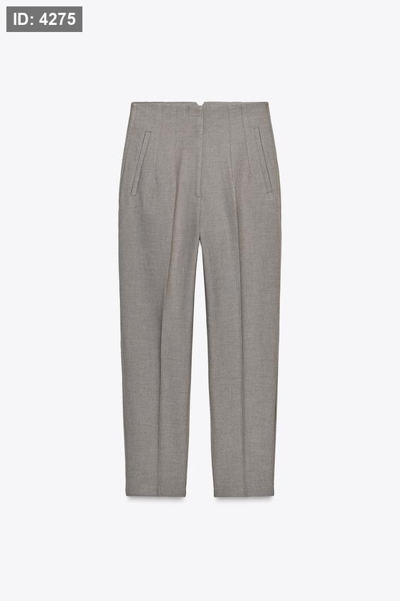 High-waist trousers with seam detail on the front and back. Front welt pockets. Front zip fly, inside button and metal hook fastening.