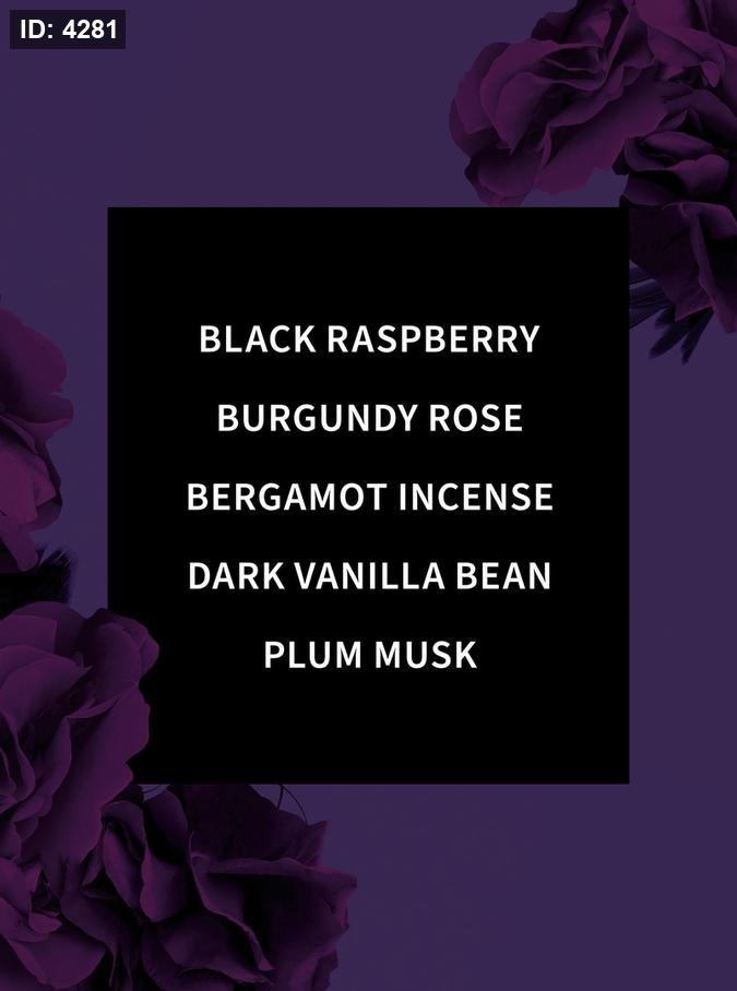 Fragrance notes: black raspberry, burgundy rose, bergamot incense, dark vanilla bean and plum musk. Ingredients