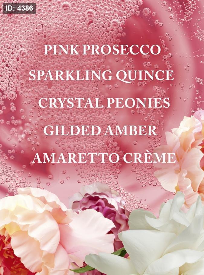 Fragrance notes: pink prosecco, crystal peonies and almond crème.