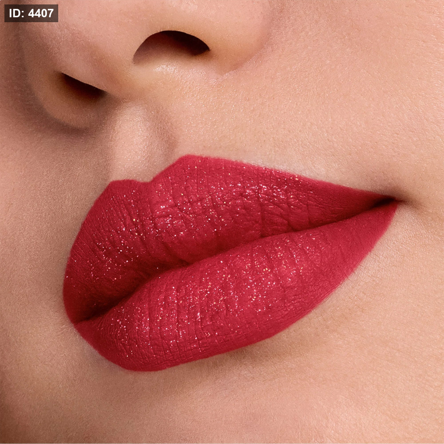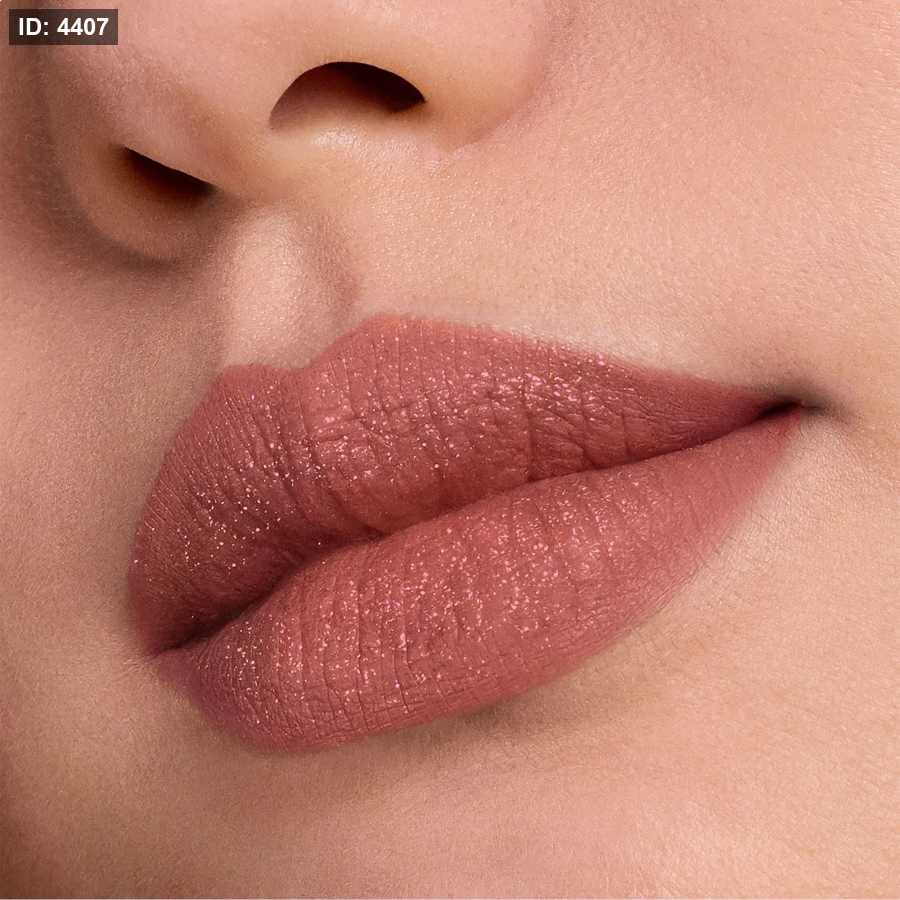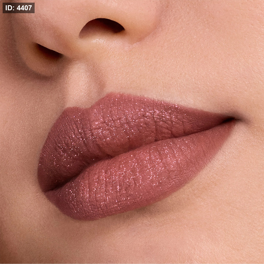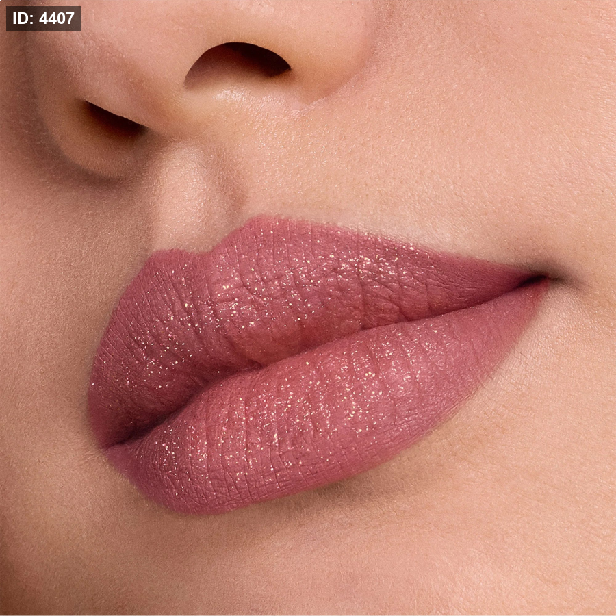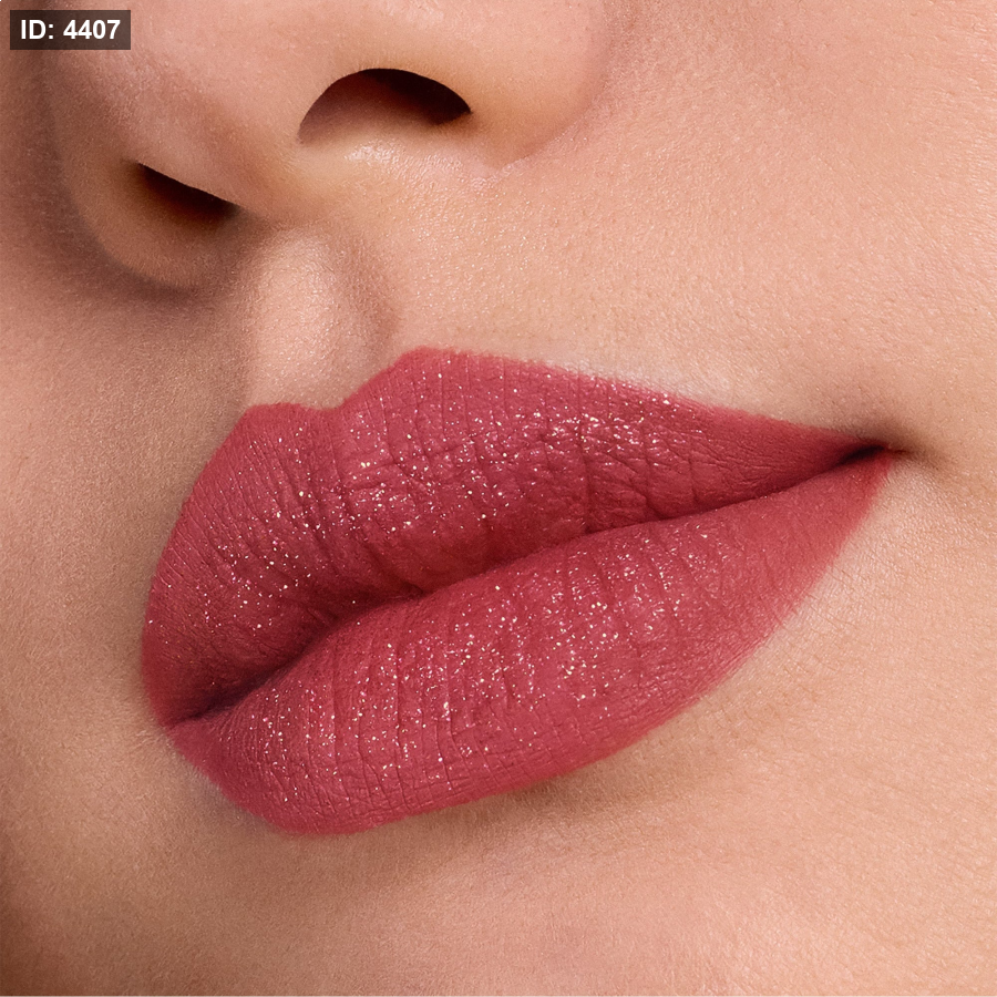 On one side — an ultra-pigmented liquid lipstick that transforms into a shimmering, glitter-filled finish with a light press of the lips.