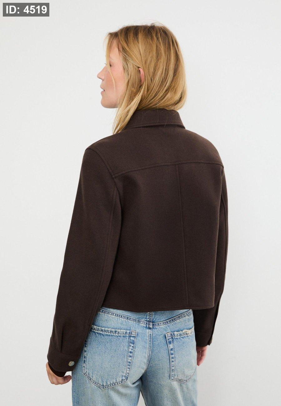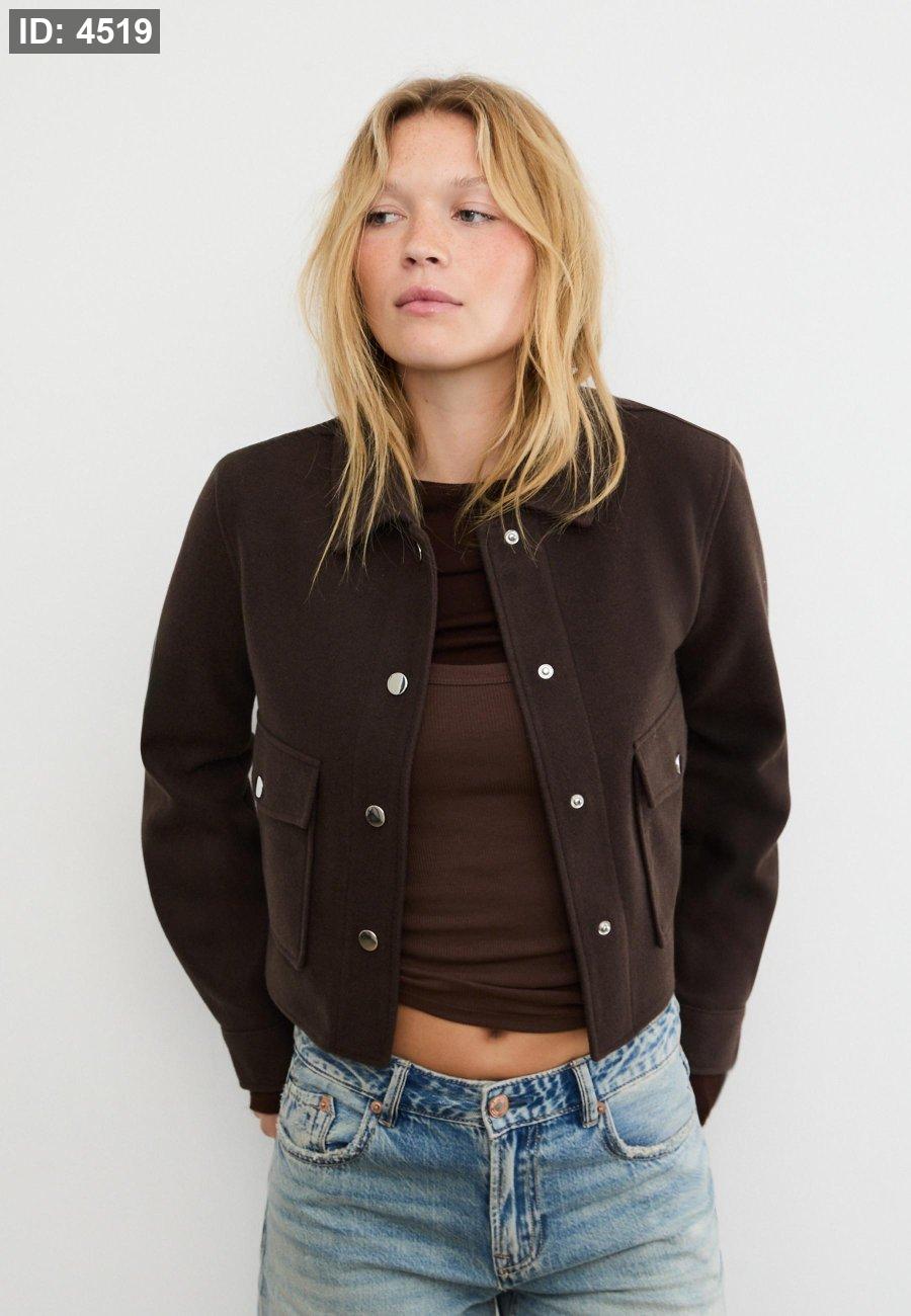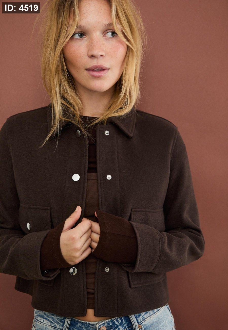 Cropped jacket made from soft-touch fabric. Lapel collar and long cuffed sleeves. Front patch pockets with flaps. Front snap-button fastening. Available in a range of colours.