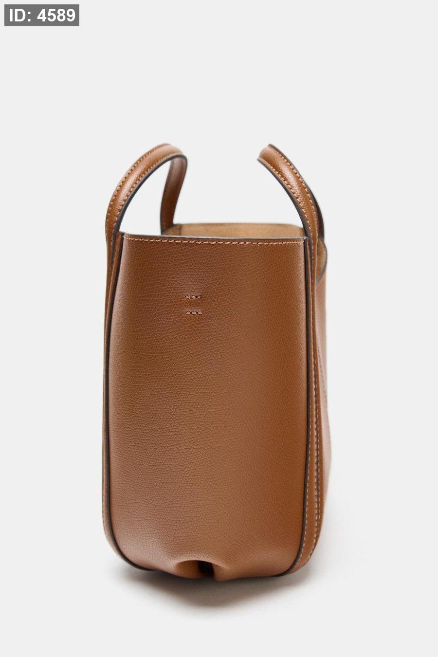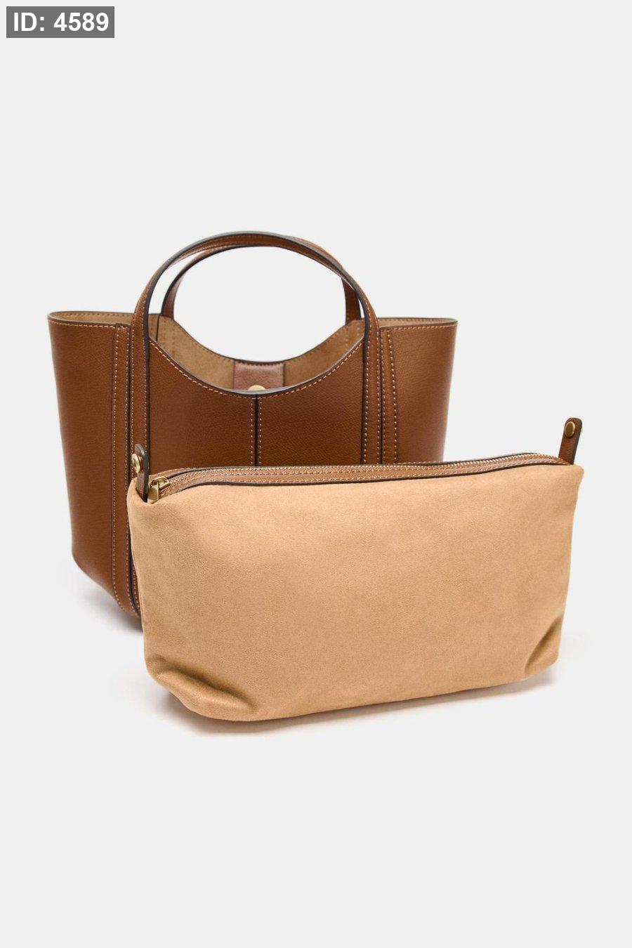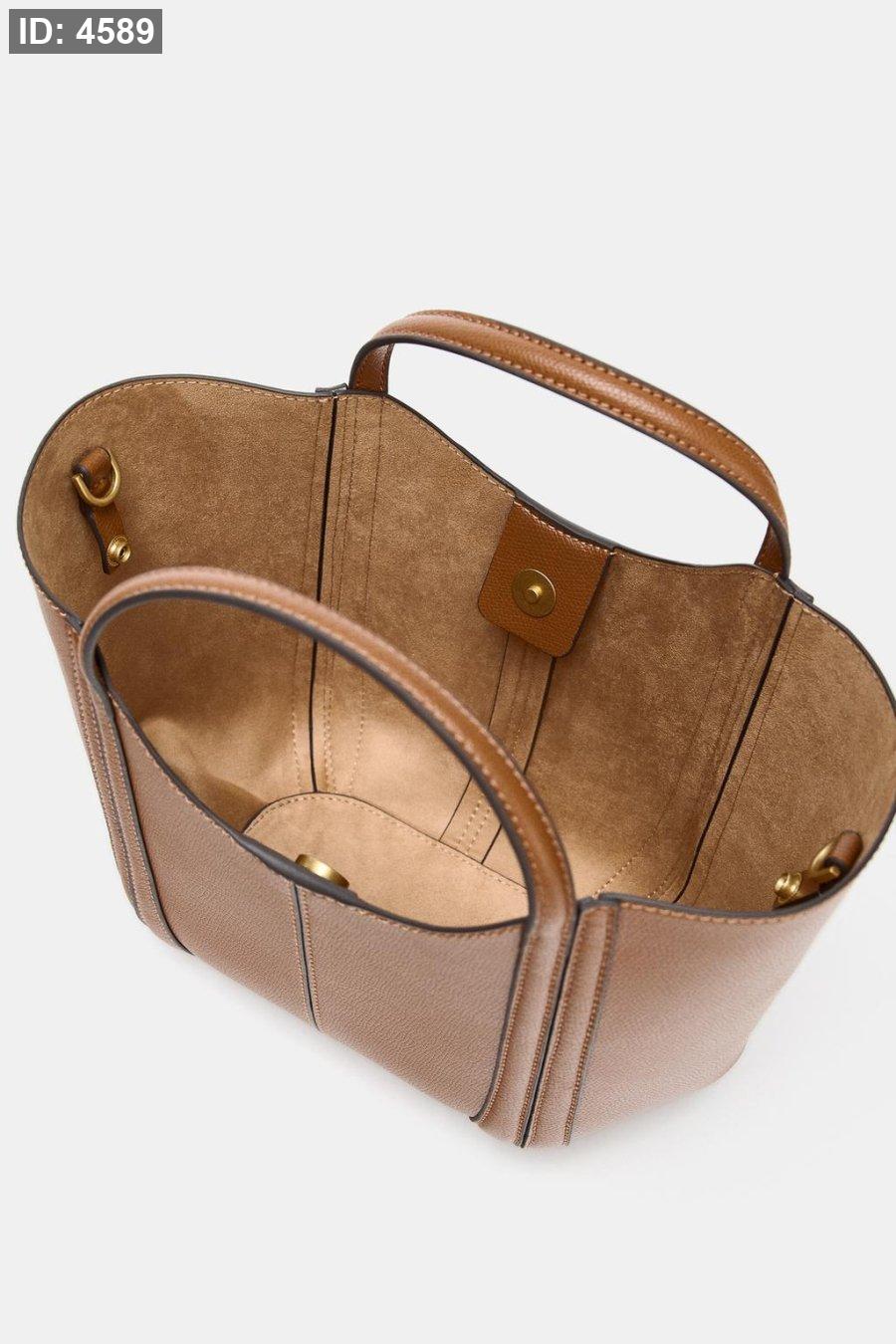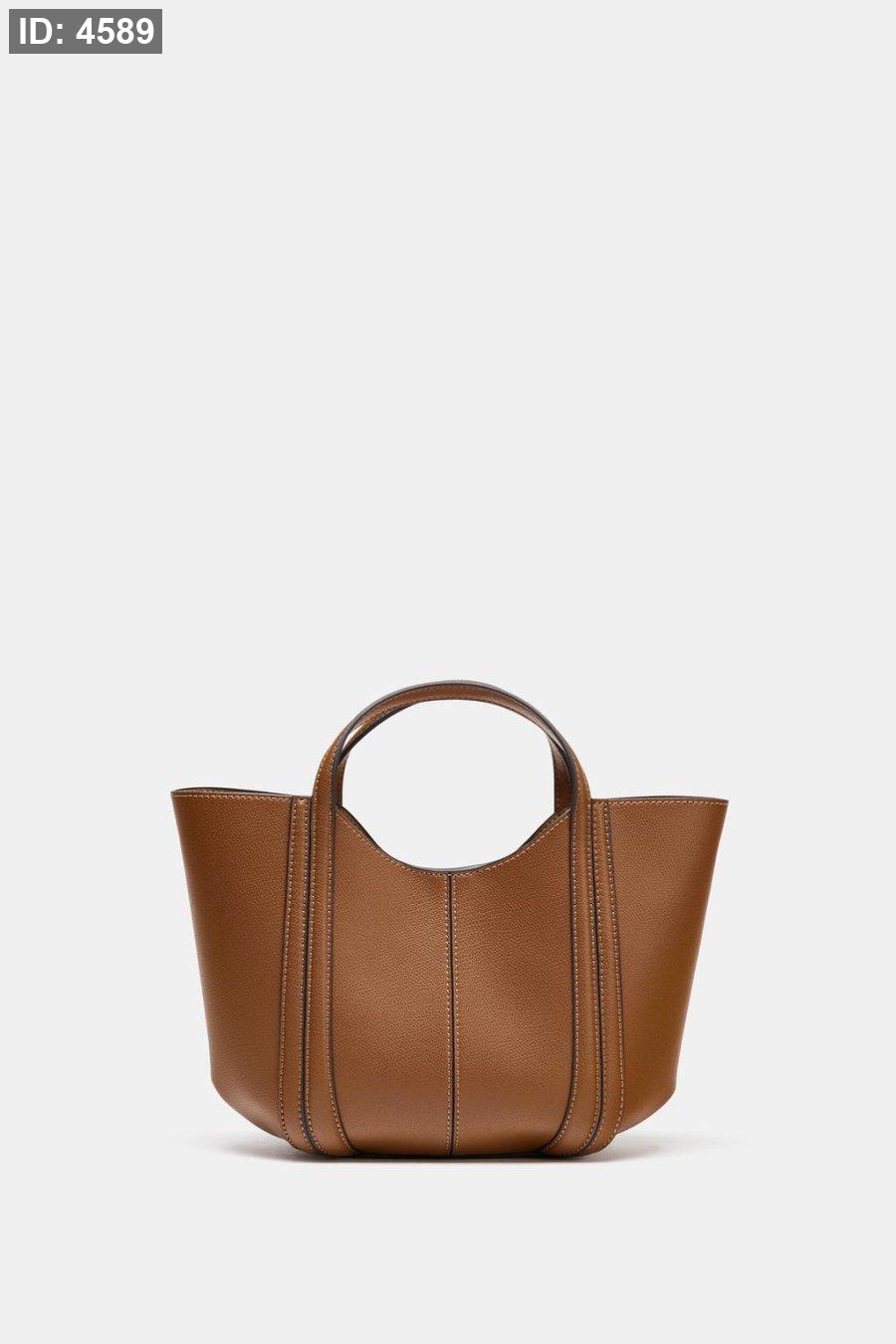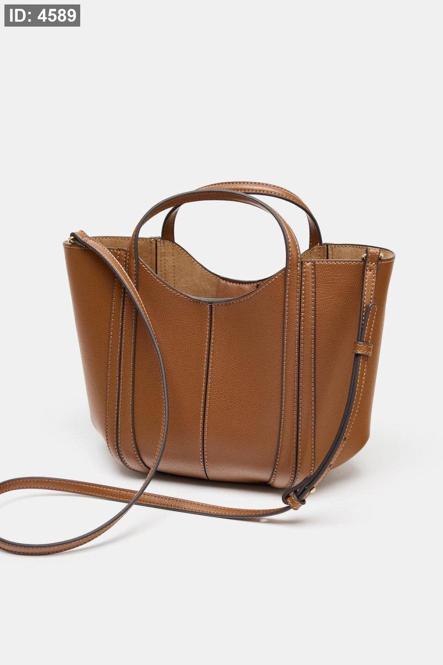 Mini city bag with contrast topstitching detail. Top handle and detachable crossbody strap. Removable inner pouch with zip closure.