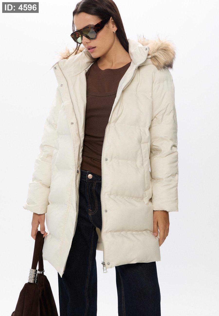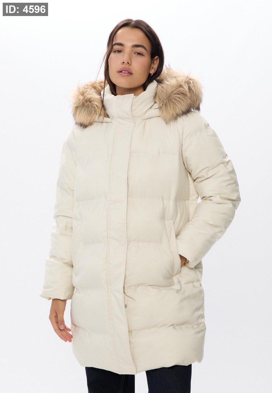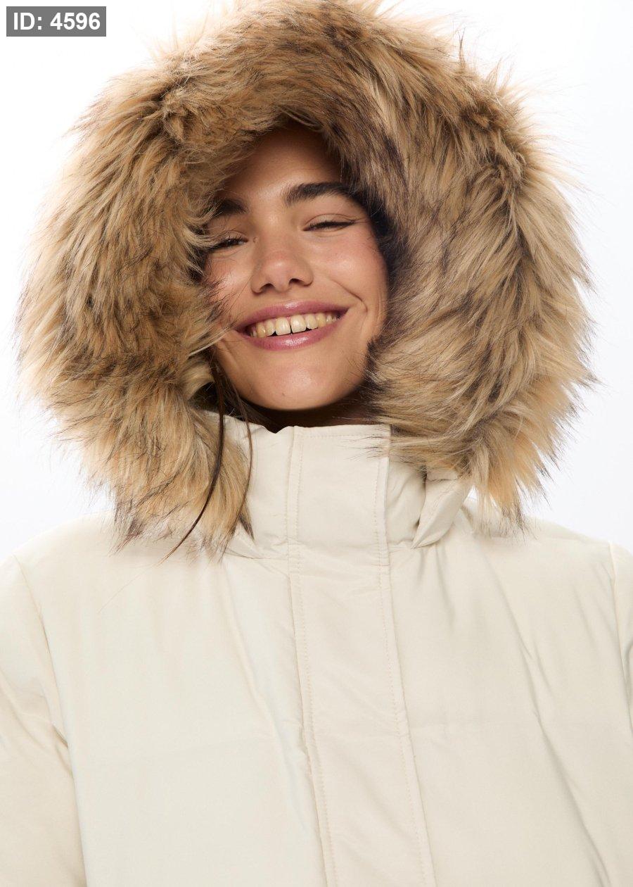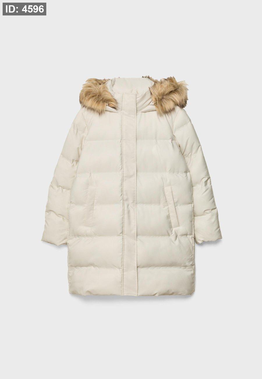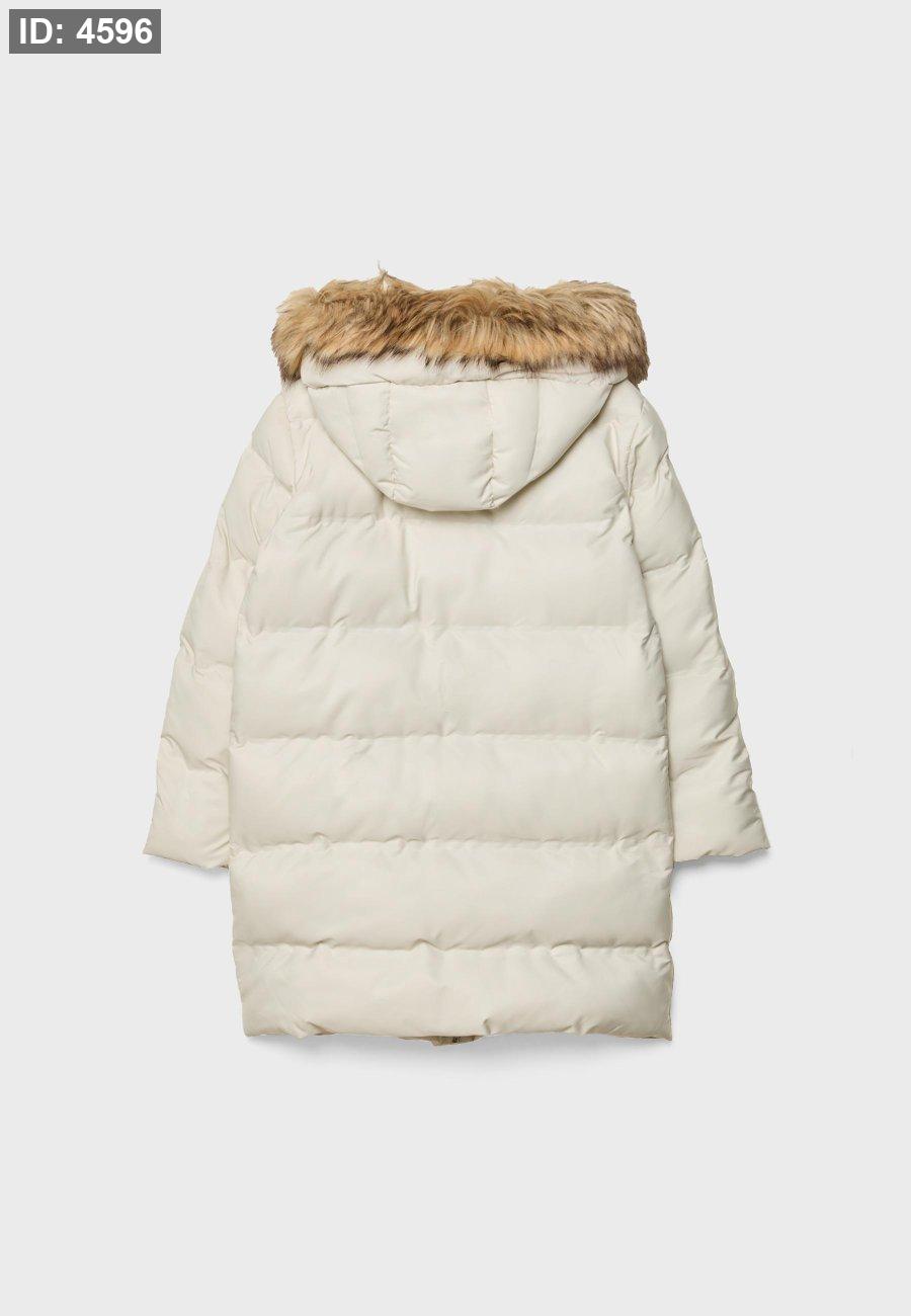 Padded coat with a high neck and hood with detachable faux fur trim. Long sleeves and front pockets. Zip-up front hidden by a snap-button placket.