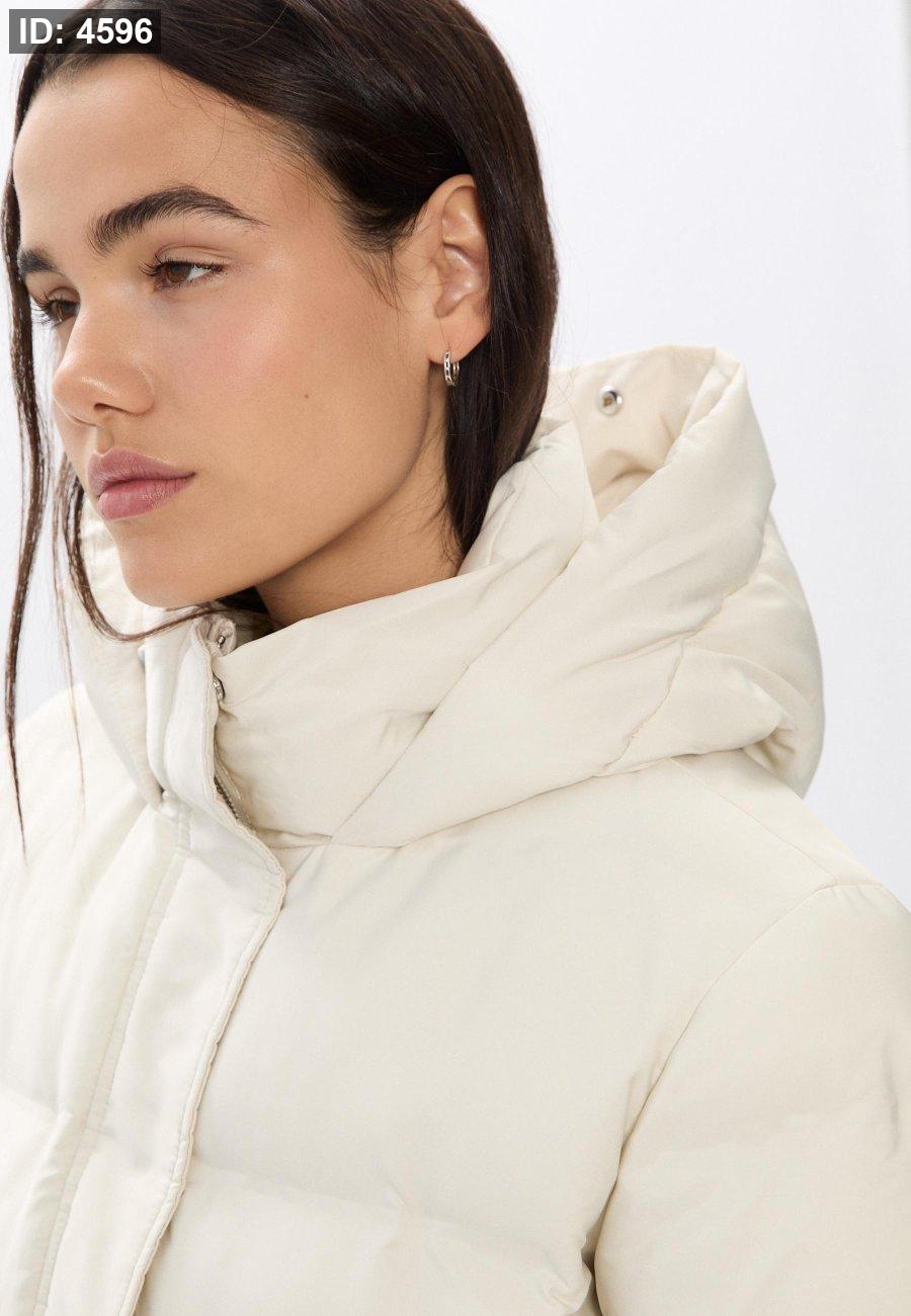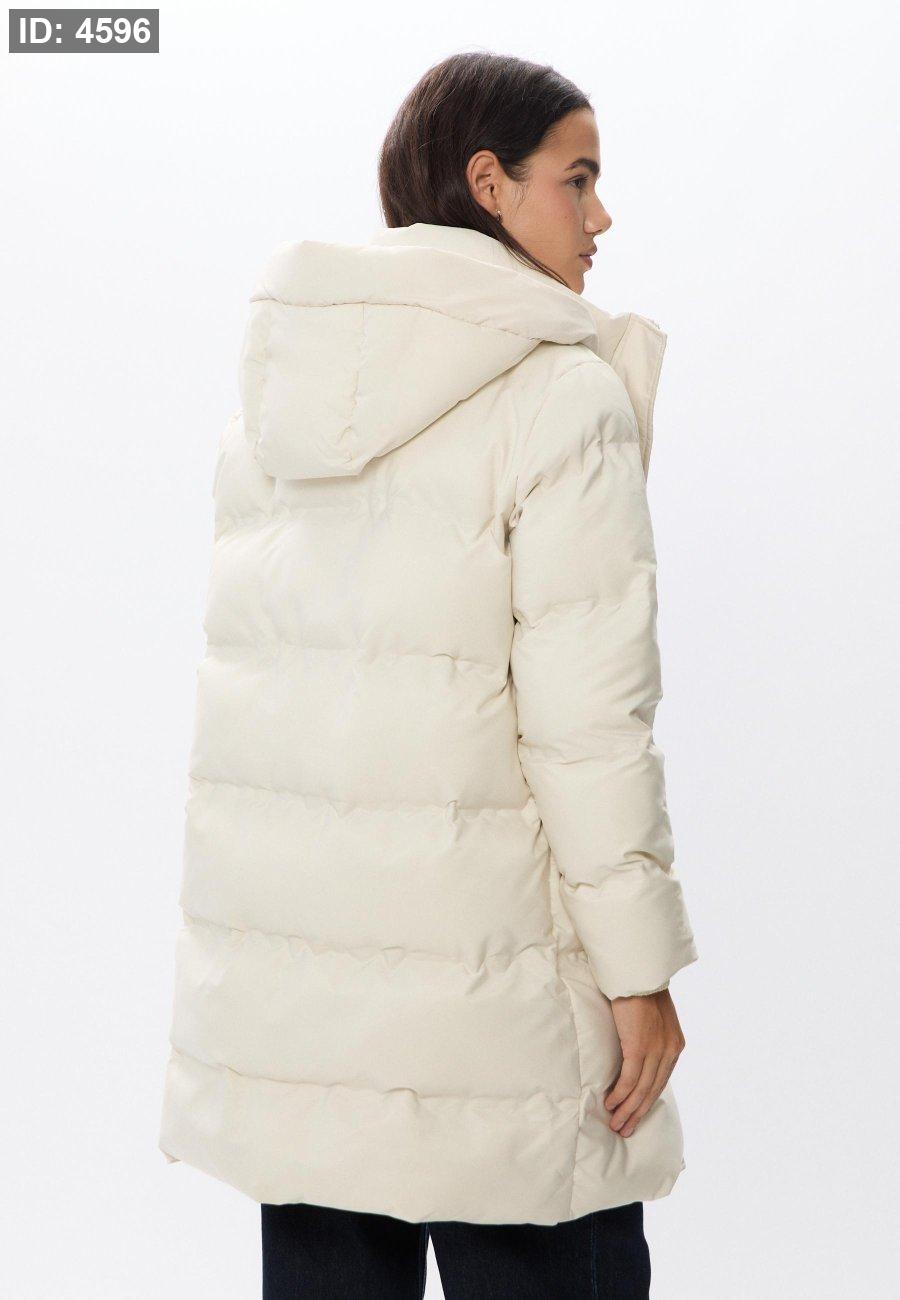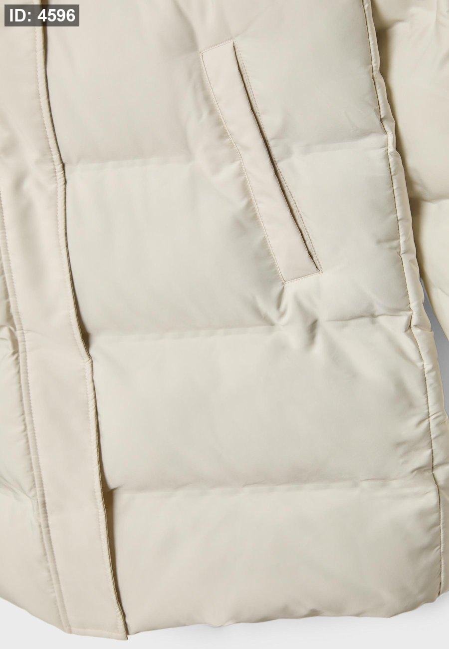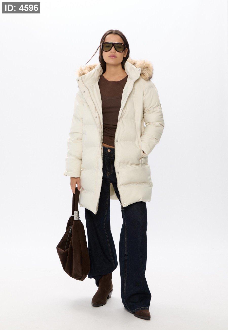 Padded coat with a high neck and hood with detachable faux fur trim. Long sleeves and front pockets. Zip-up front hidden by a snap-button placket.