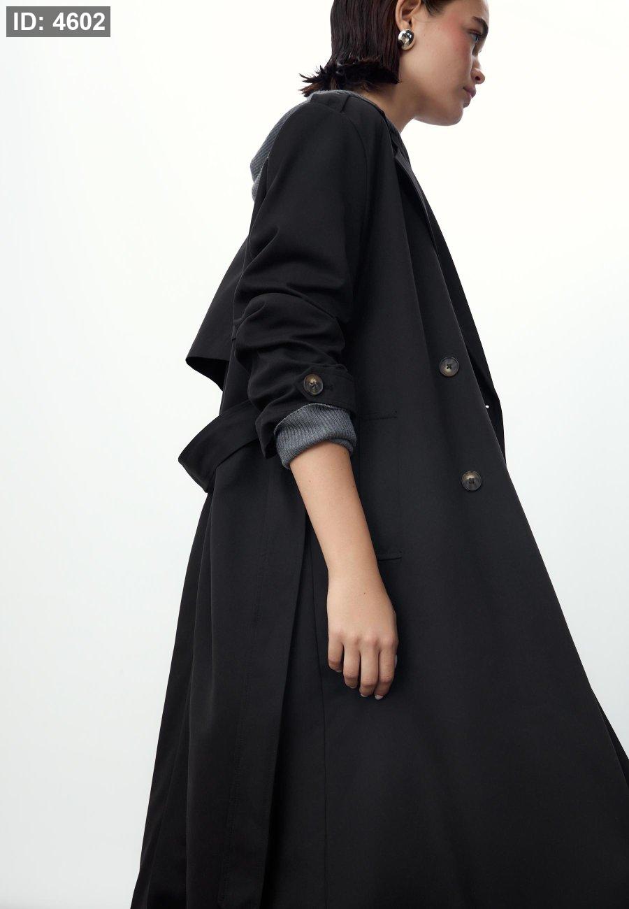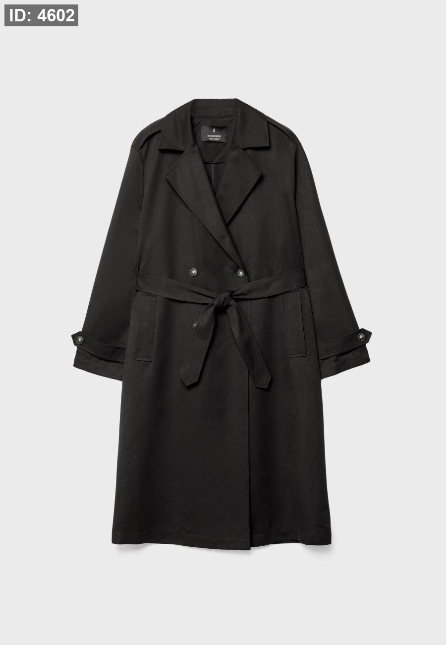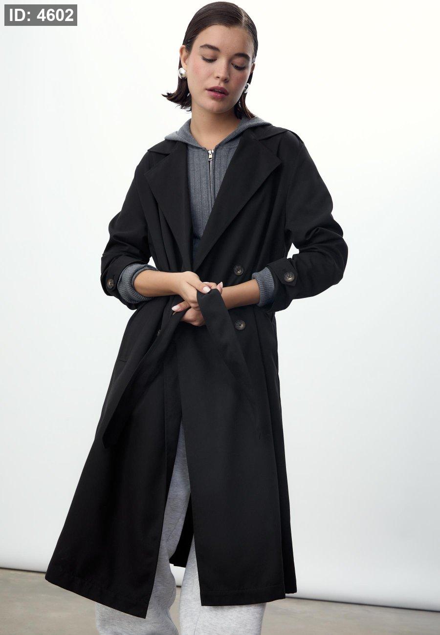 Long flowing trench coat with a lapel collar, long sleeves, side pockets, double-breasted button fastening and a belt. Available in several colours.
