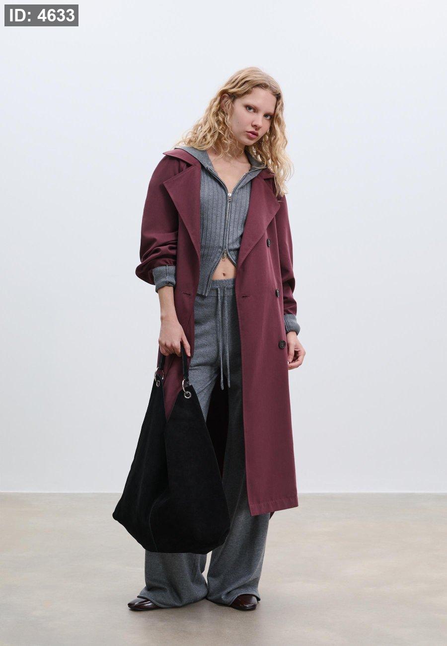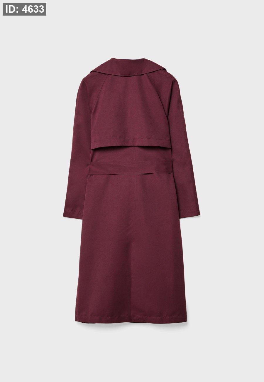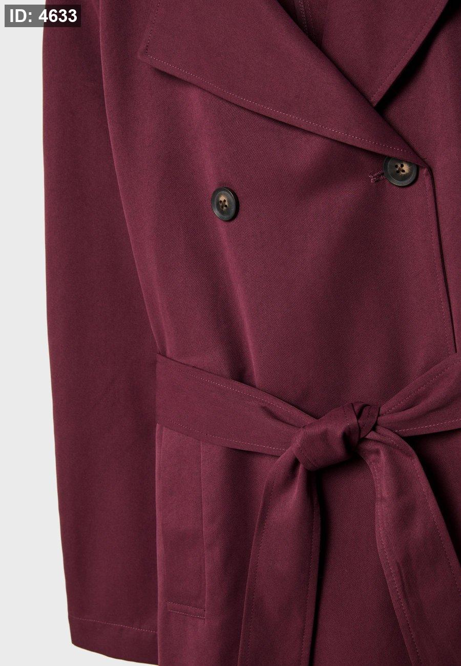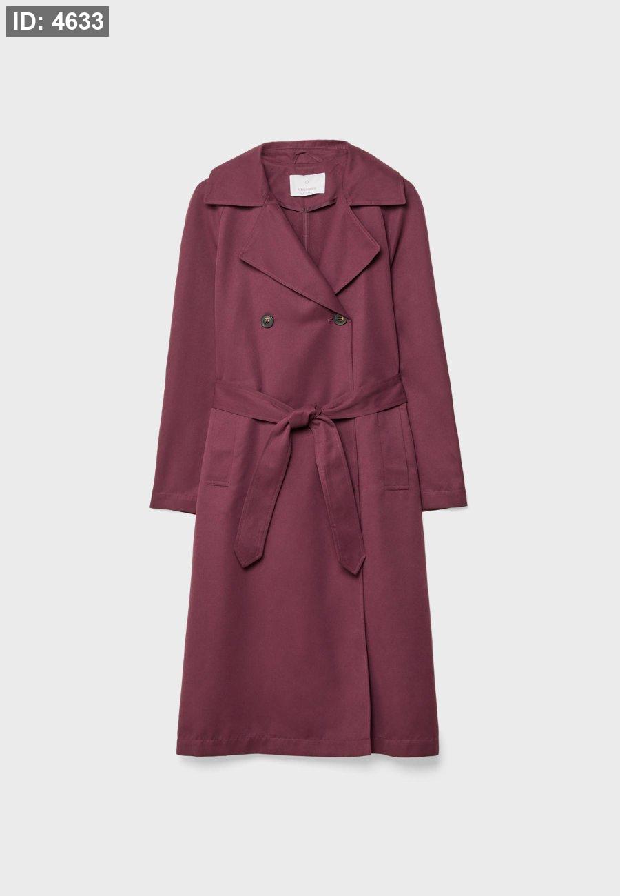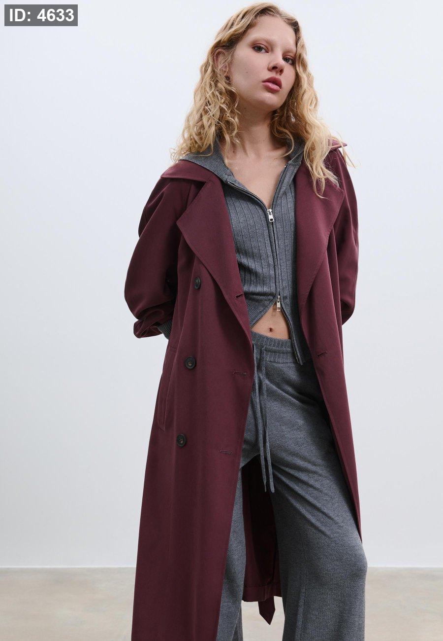 Long trench coat with a loose fit, lapel collar and long sleeves. Side welt pockets. Detachable belt in the same fabric for cinching at the waist. Button-up front. Available in several colours.