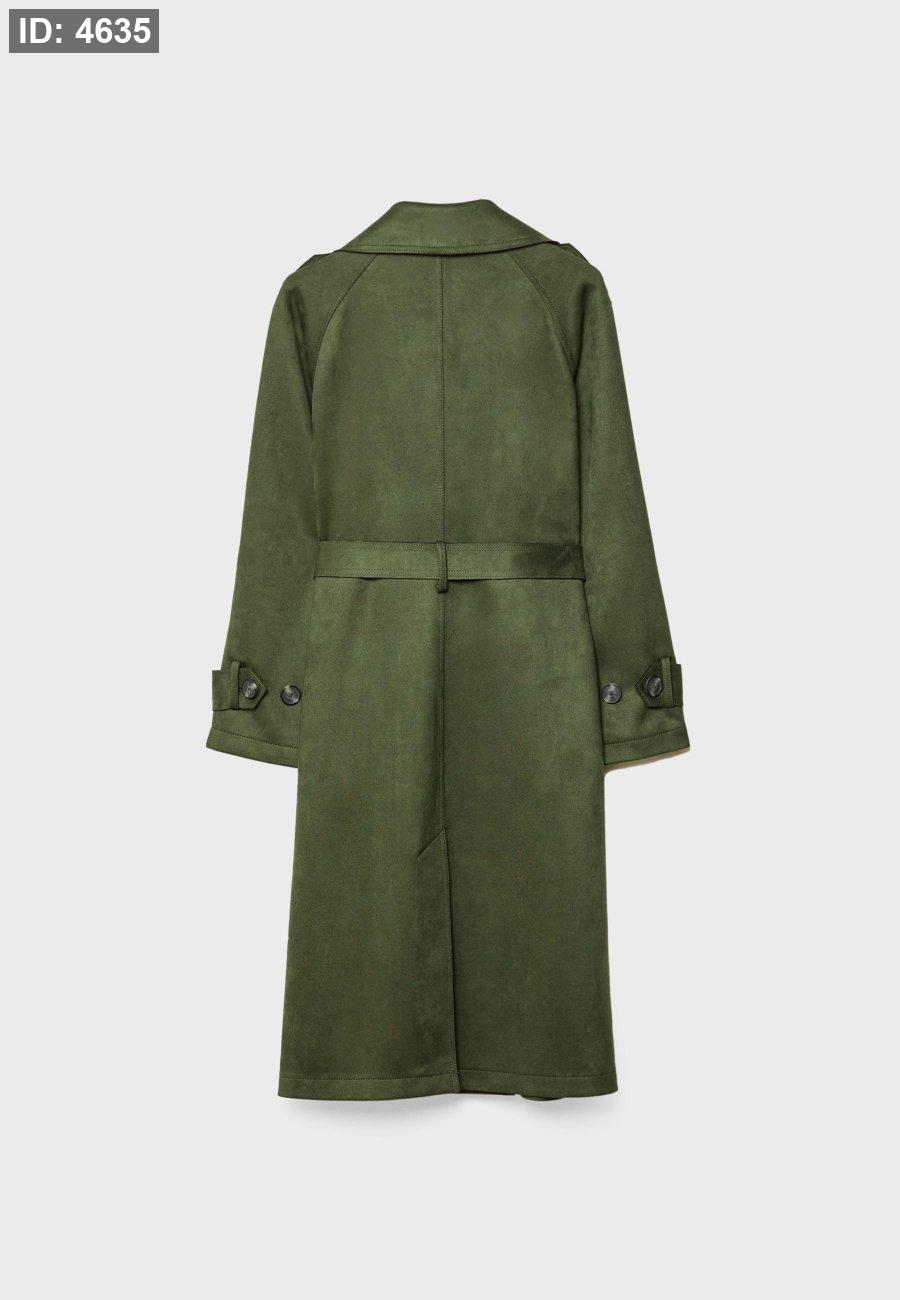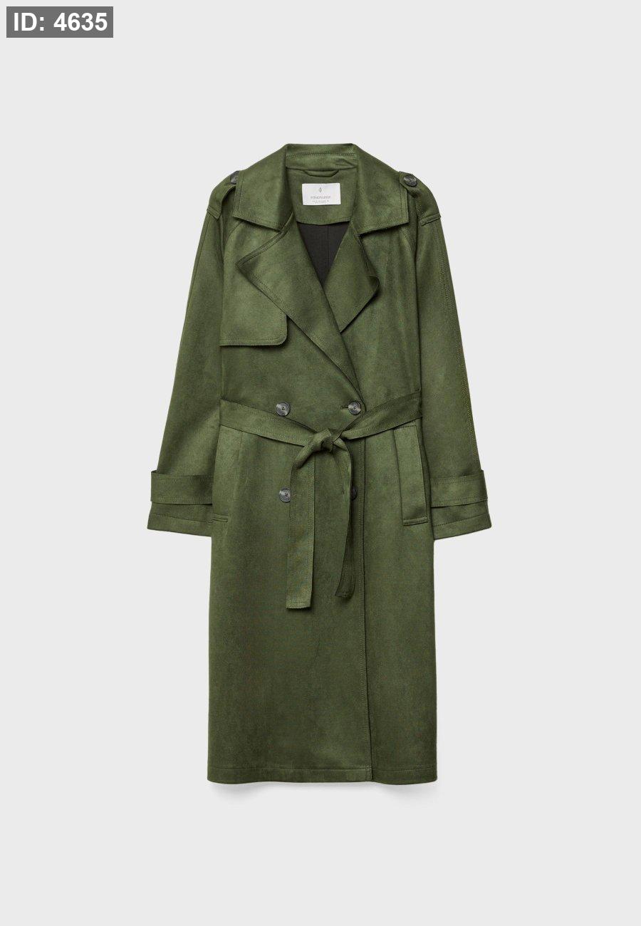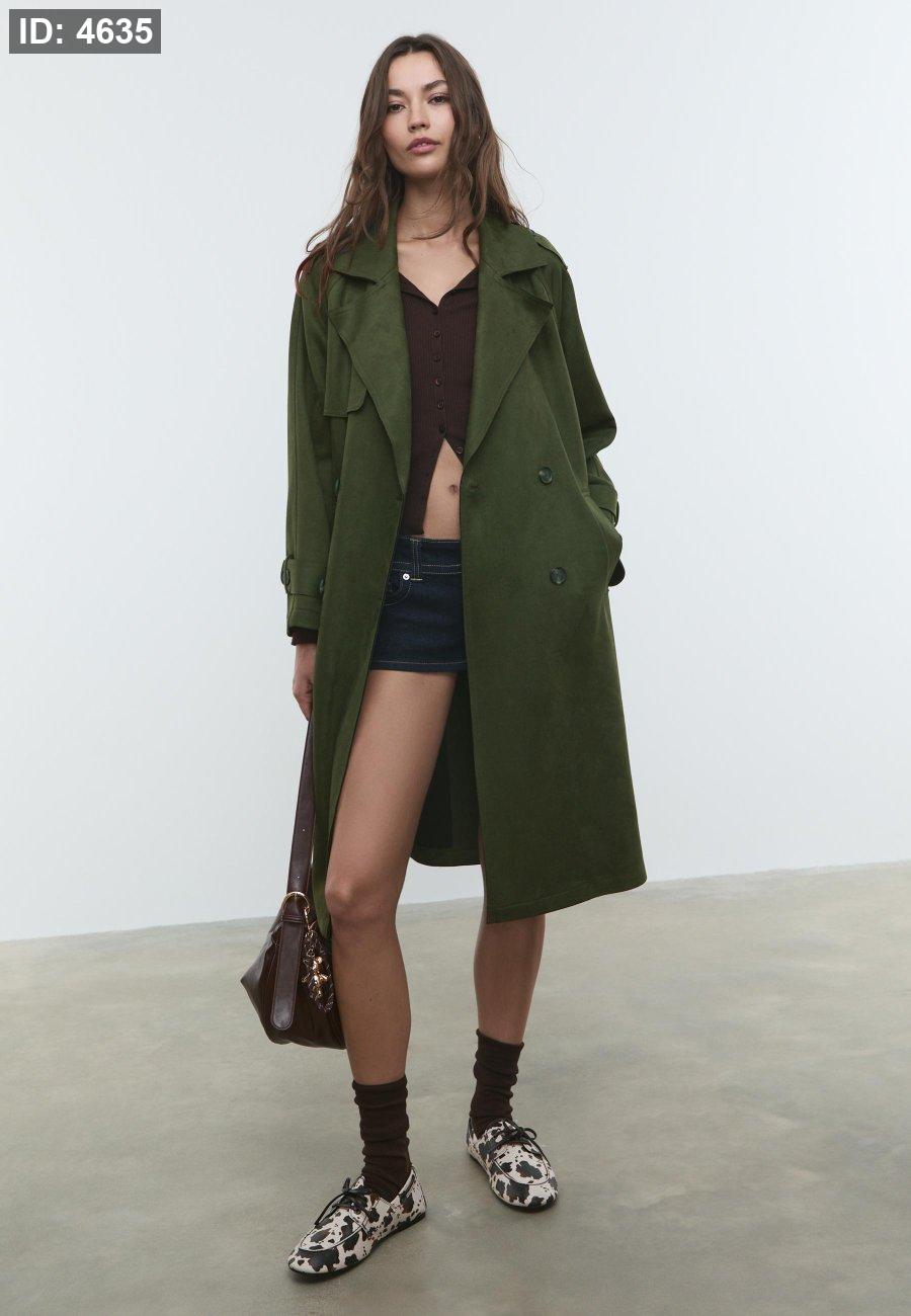 Long trench coat featuring a lapel collar and long sleeves with buttoned tabs. Front welt pockets. Shoulder tabs. Double-breasted button fastening on the front and a belt in the same fabric.