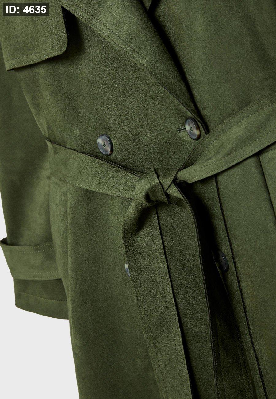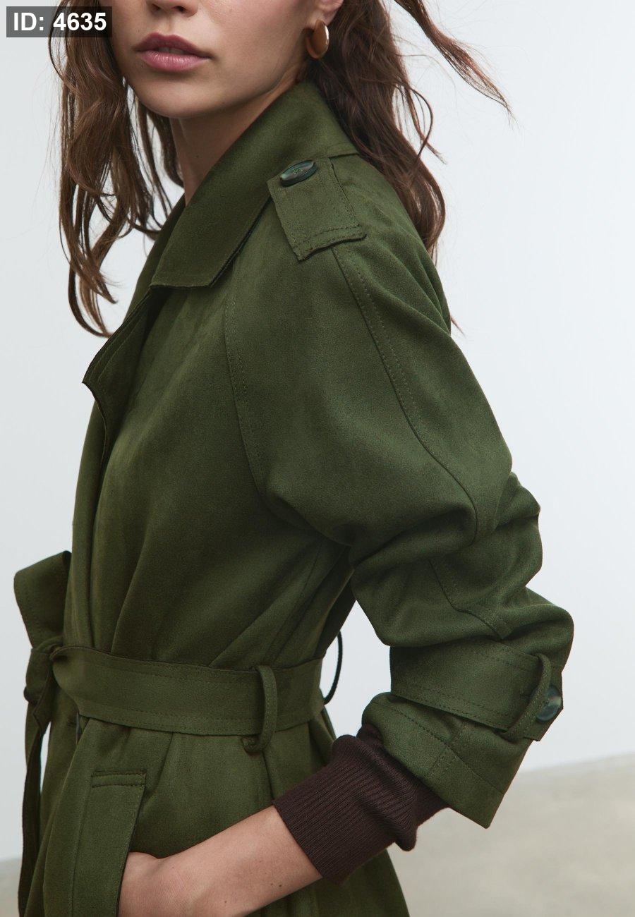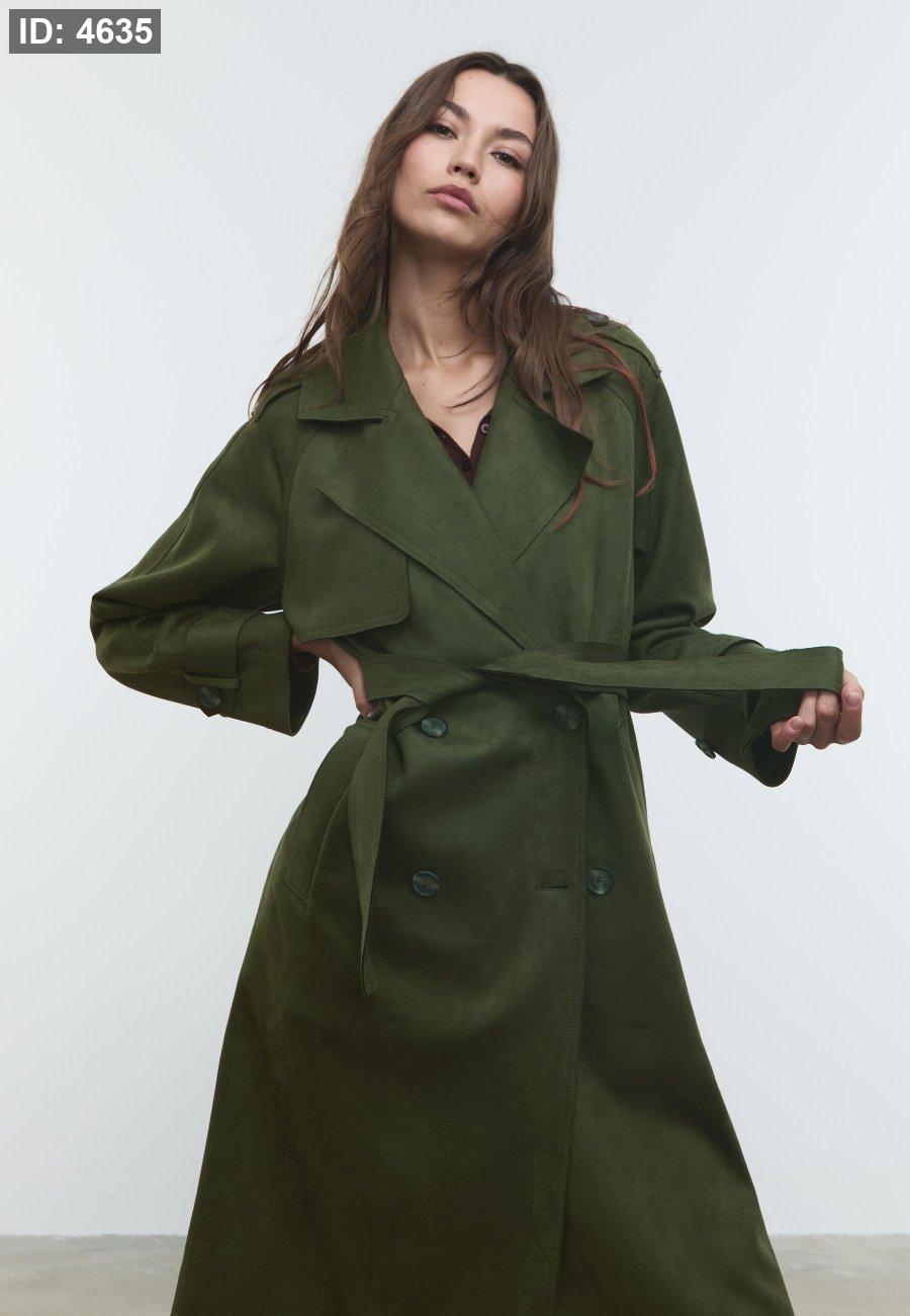 Long trench coat featuring a lapel collar and long sleeves with buttoned tabs. Front welt pockets. Shoulder tabs. Double-breasted button fastening on the front and a belt in the same fabric.