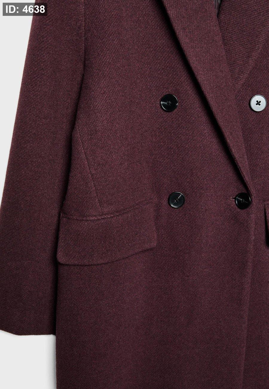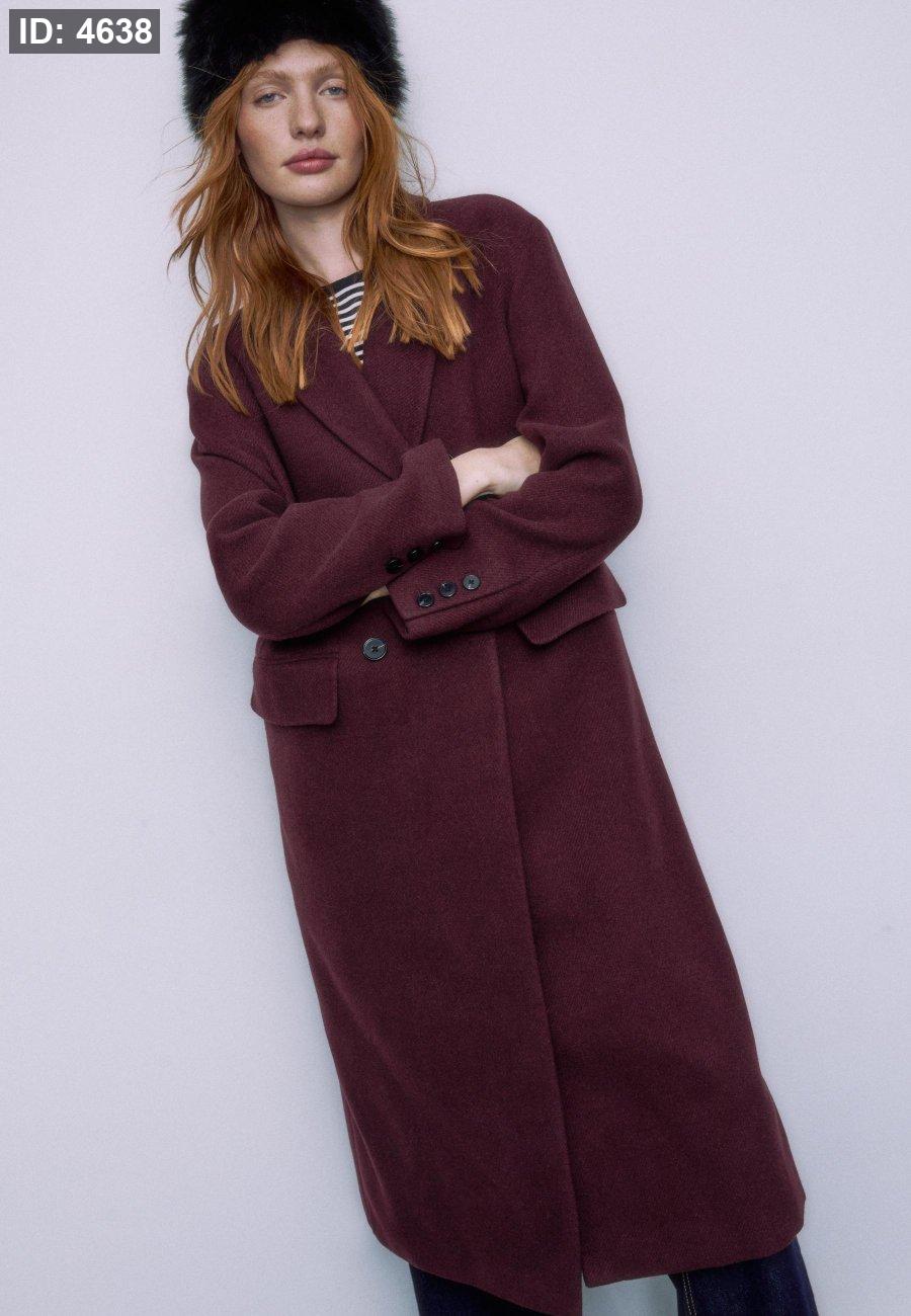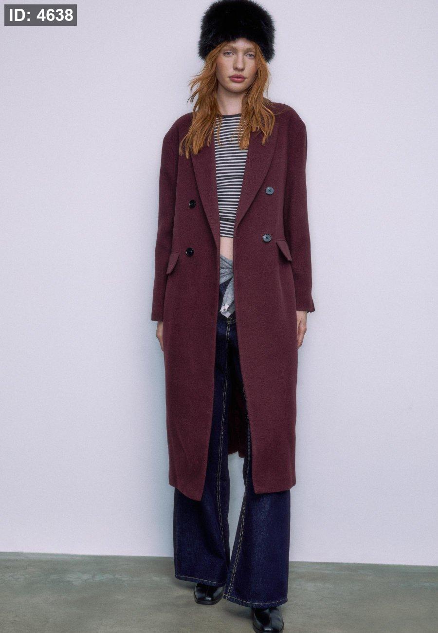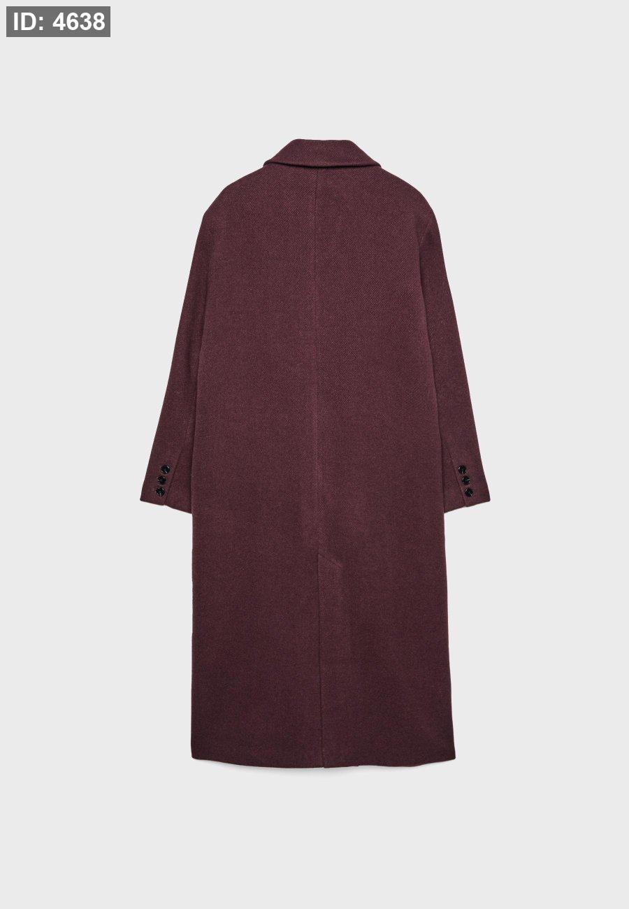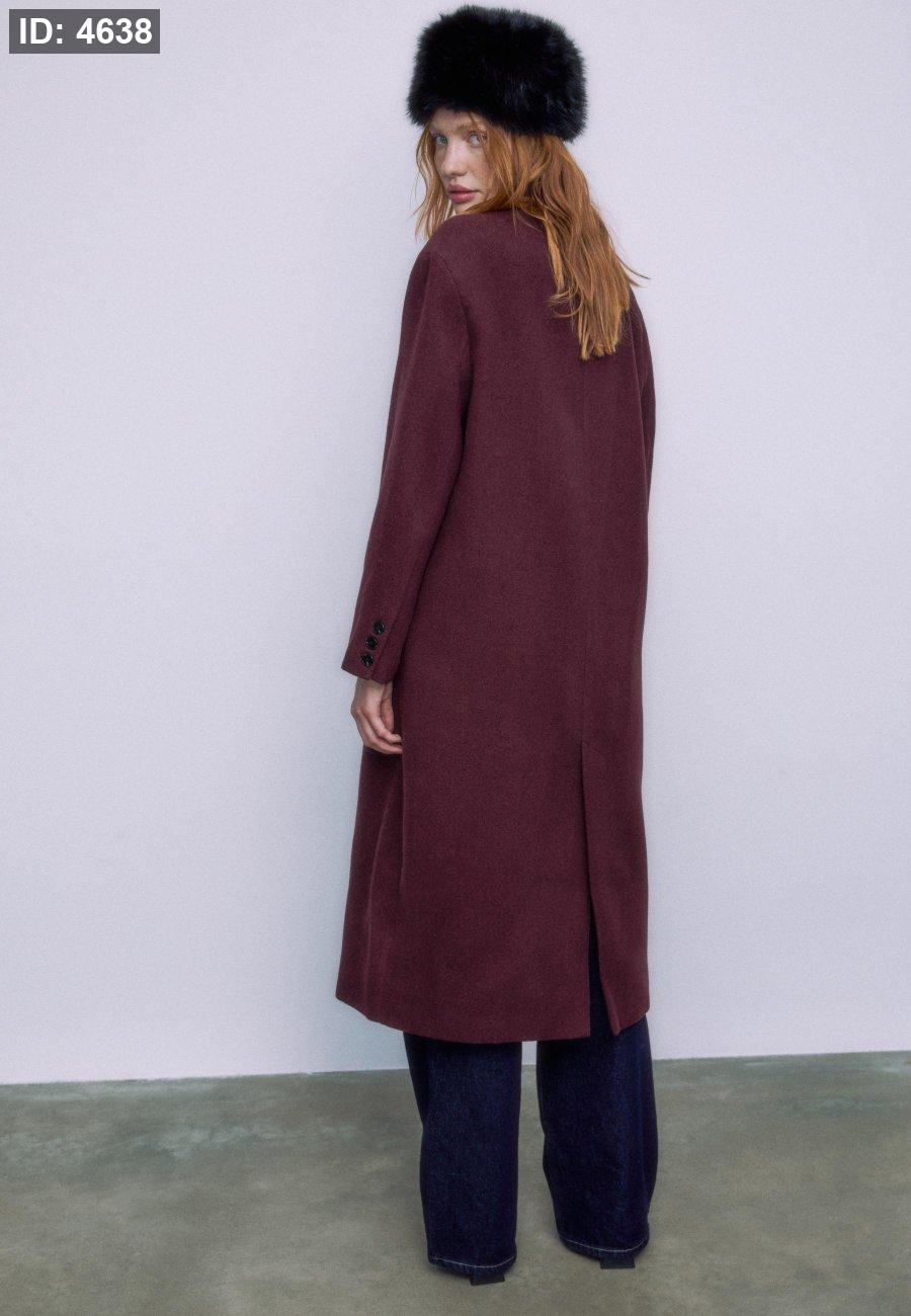 Long oversize coat. Lapel collar and long sleeves. Front welt pocket with flap. Double-breasted button fastening.