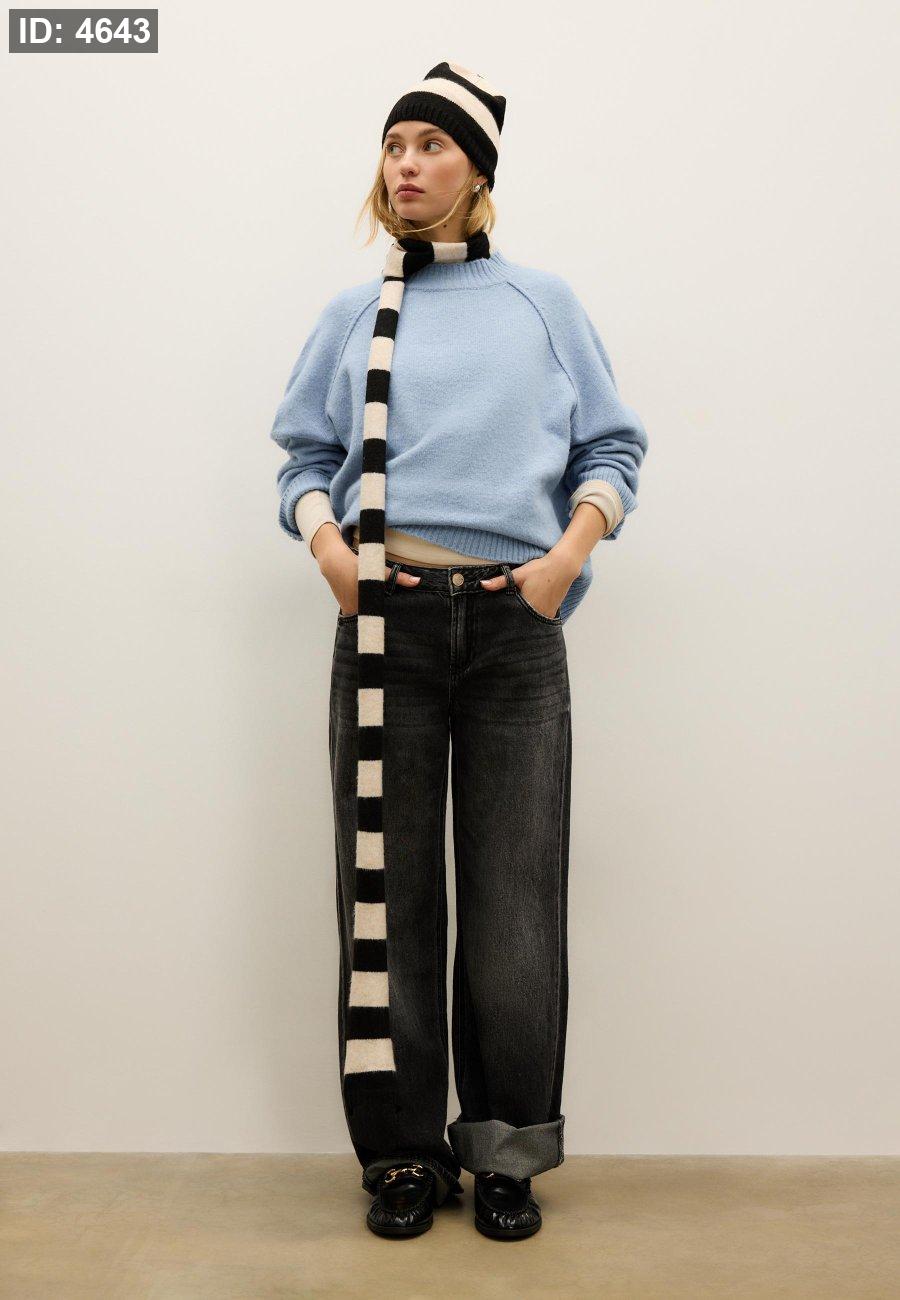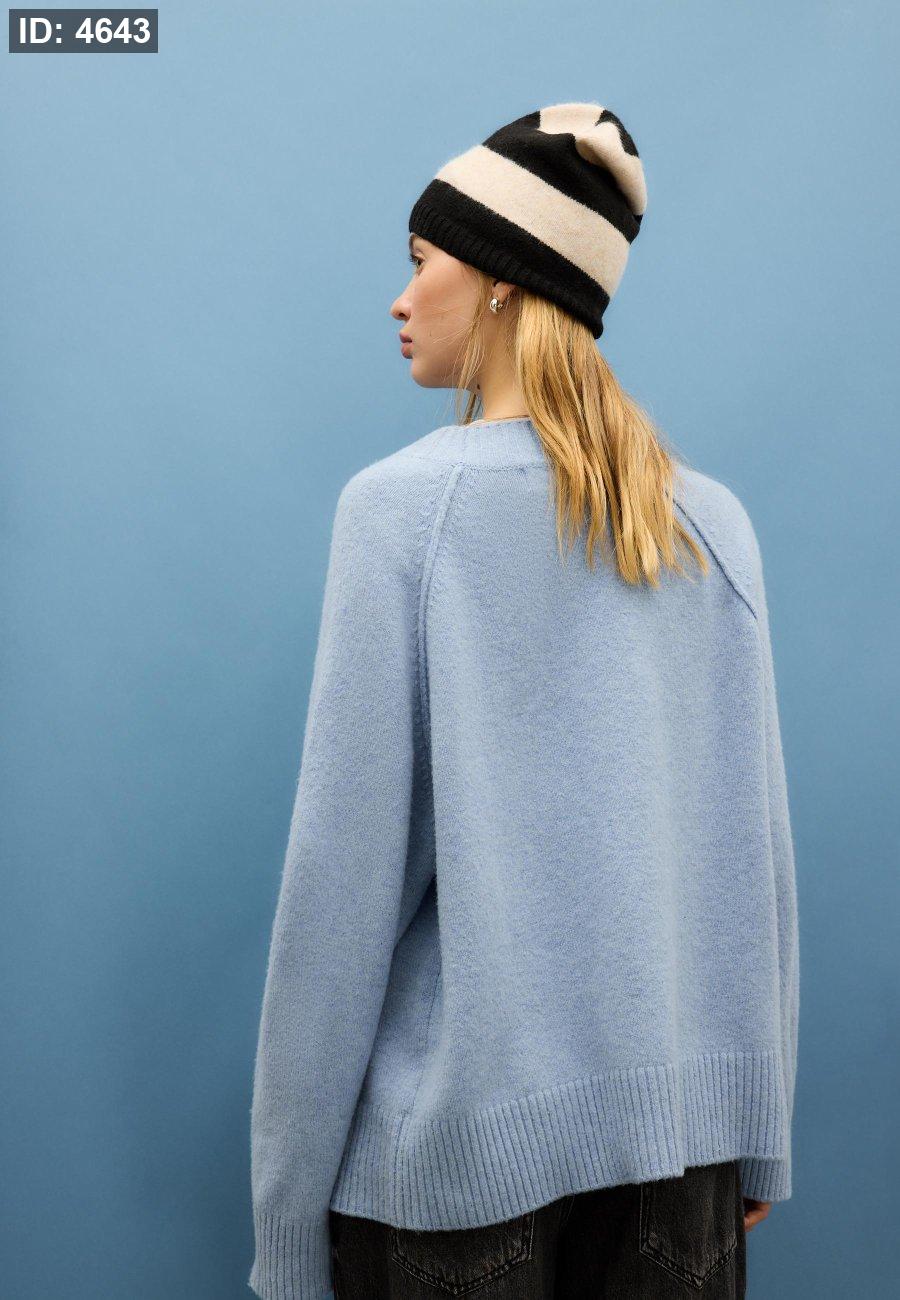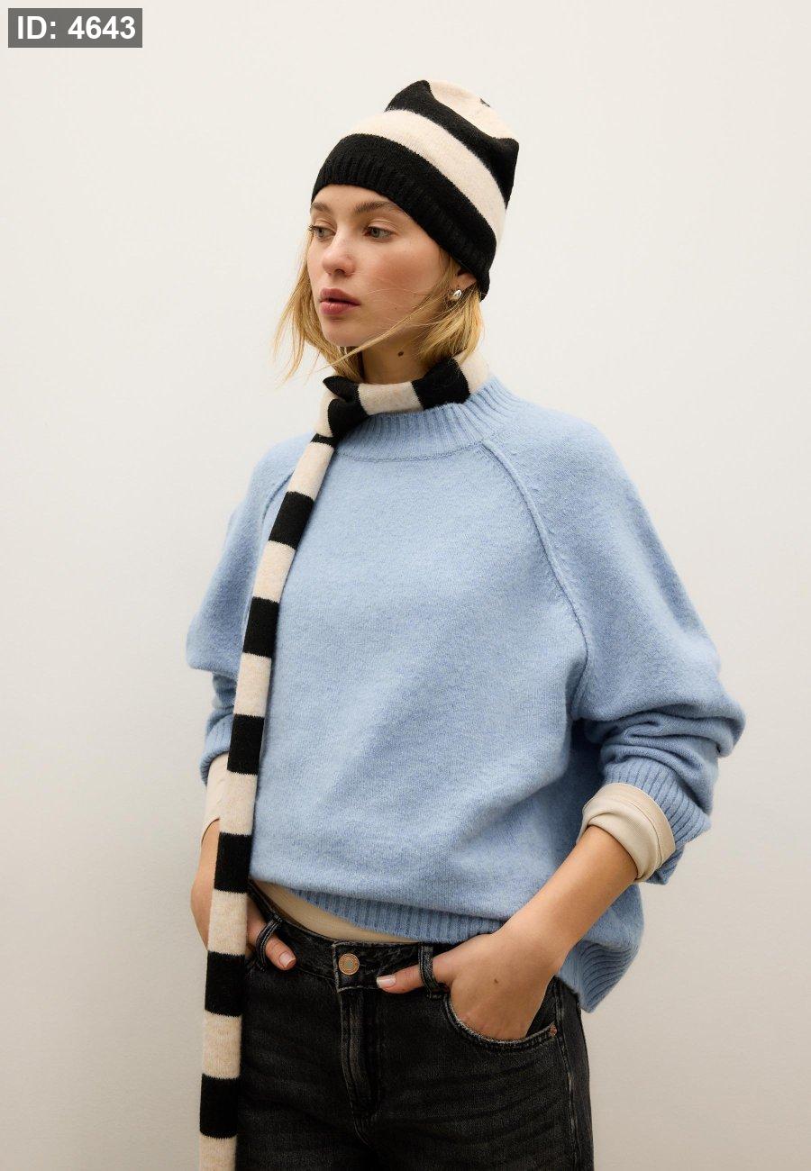 Knitted jumper with a round neck and long raglan sleeves. Ribbed trims. Available in various colours.