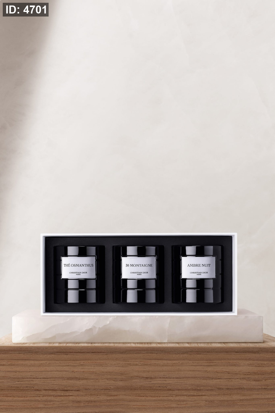 Discover the candles from the La Collection Privée series in a set that includes three iconic signatures: Ambre Nuit, 30 Montaigne and Thé Osmanthus.
