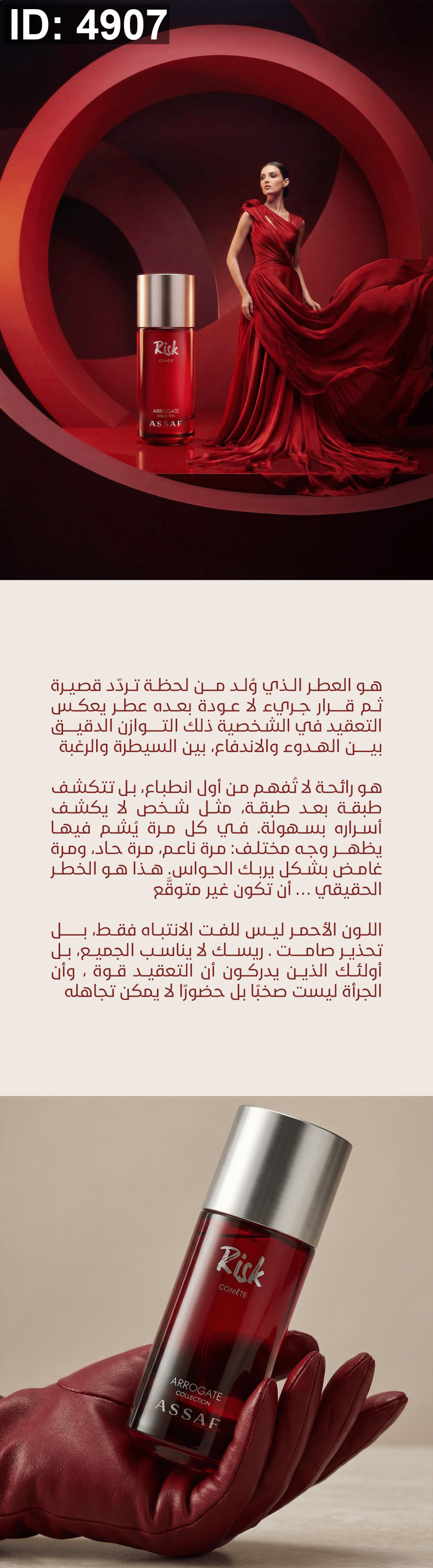 اللون الأحمر ليس للفت الانتباه فقط، بل نحذير صامت . ريسك لا يناسب الجميع، بل أولئك الذين يدركون أن التعقيد قوة ، وأن الجرأة ليست صخبًا بل حضورًا لا يمكن تجاهله