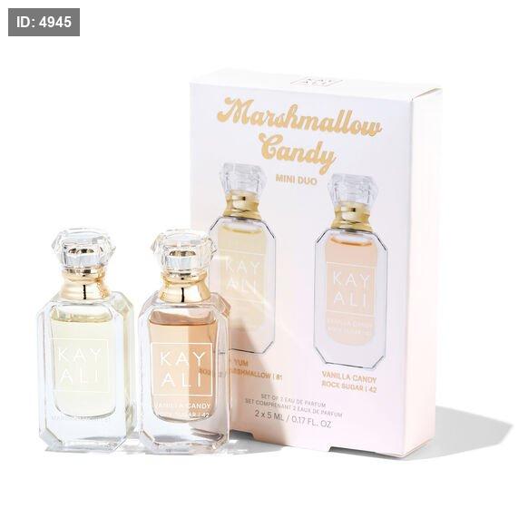 Experience the irresistible sweetness of the KAYALI Marshmallow Candy Mini Duo, a fragrance set that pairs Yum Boujee Marshmallow | 81 Eau de Parfum Intense with Vanilla Candy Rock Sugar | 42 Eau de Parfum in 5ml bottles.