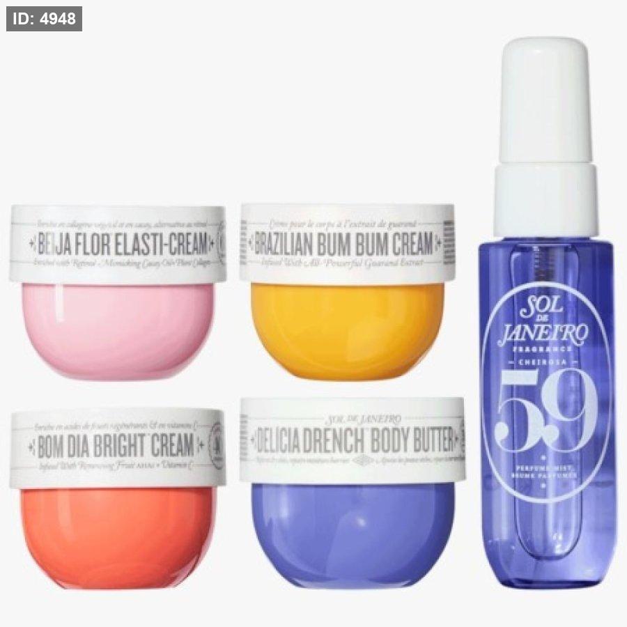 مجموعة من منتجات العناية بالجسم من ماركة Sol de Janeiro، وهي ماركة برازيلية معروفة بمنتجاتها المعطرة والمرطبة.