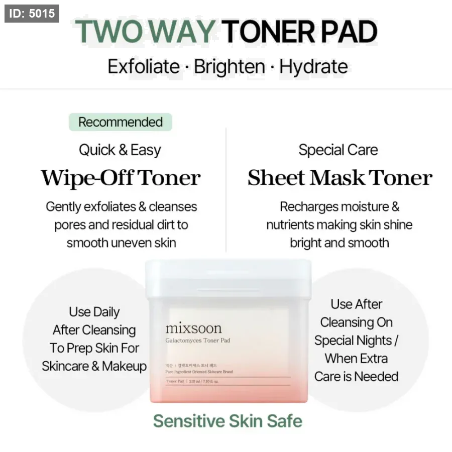 The mixsoon Galactomyces Toner Pad is the ultimate solution for achieving radiant, smooth, and translucent skin. Packed with the nourishing power of Galactomyces extract, it helps to brighten dull skin, refine texture, and balance skin tone. The toner pads are designed to improve elasticity, hydrate deeply, and leave your skin feeling refreshed and rejuvenated. With the added benefit of gentle exfoliation, it removes dead skin cells without irritation, creating a perfect canvas for the next steps in your skincare routine. Enjoy smoother, brighter, and healthier skin with every use!