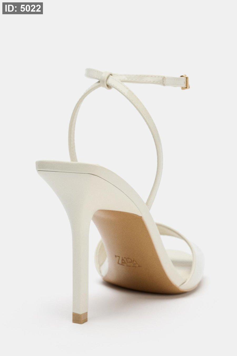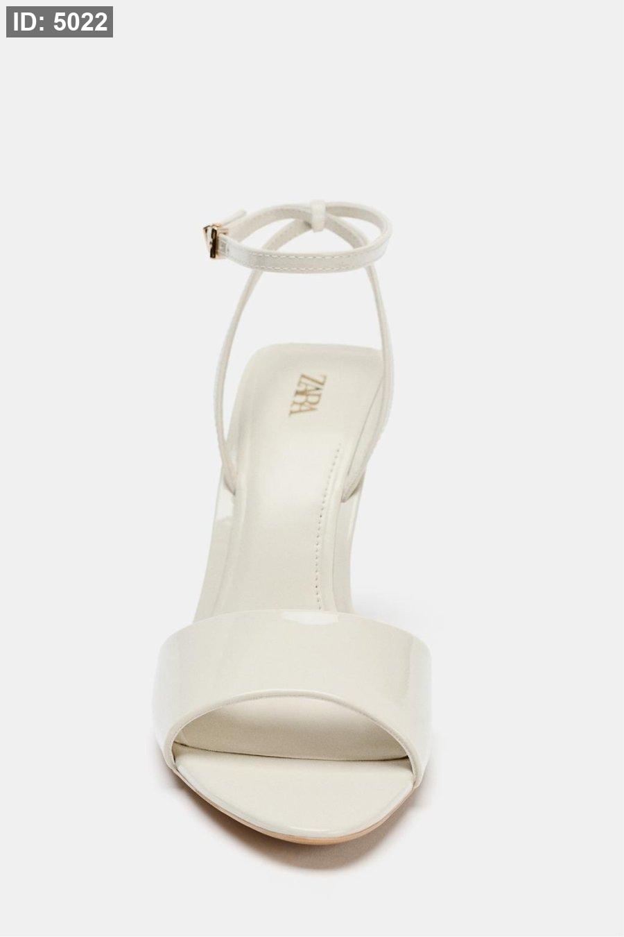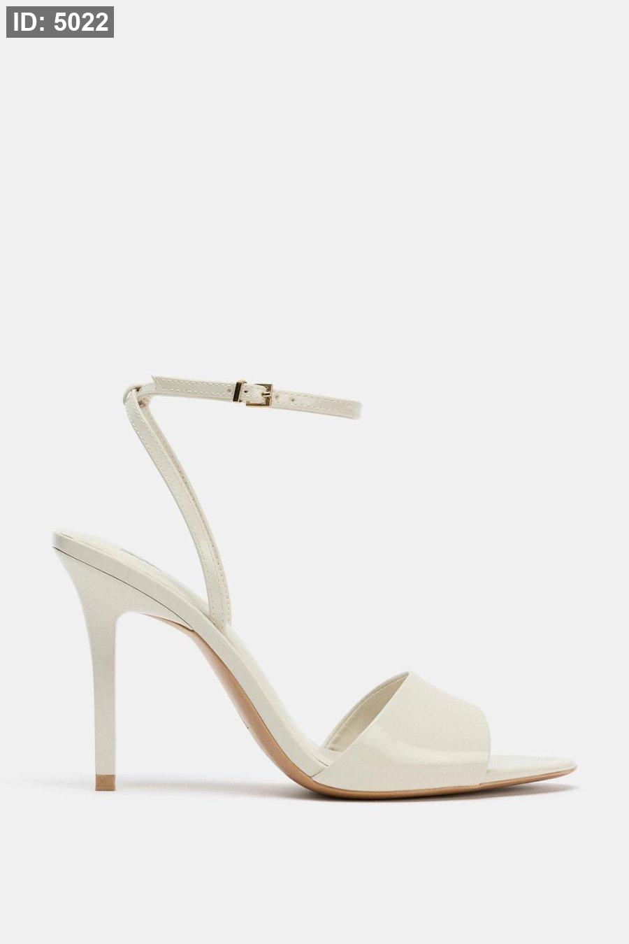 High-heel sandals with a patent finish. Wide front strap. Buckled ankle strap fastening.