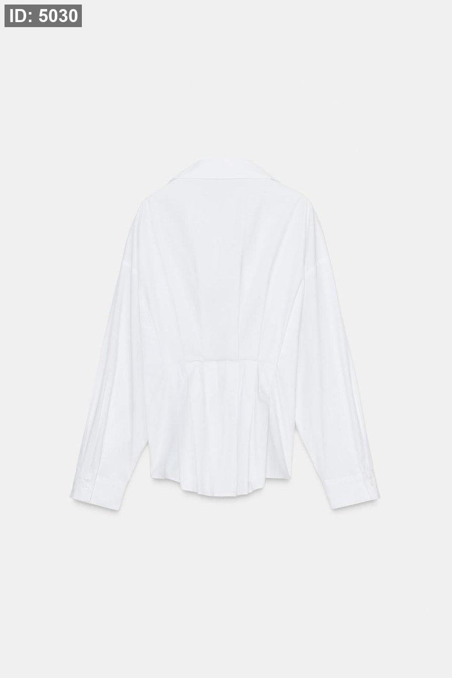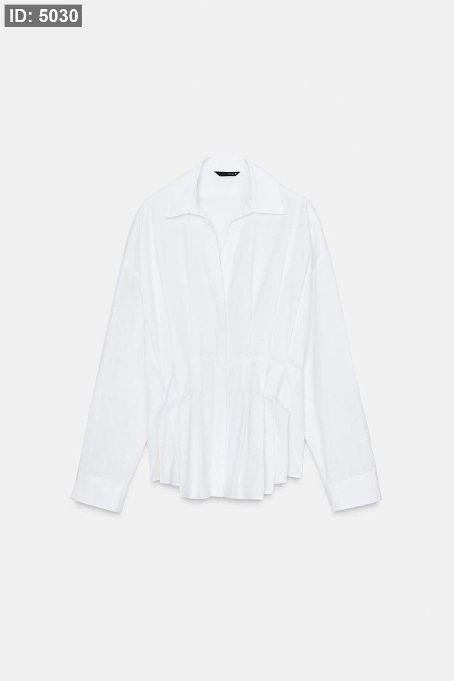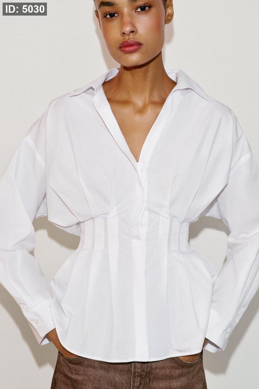 Collared shirt with a v-neck and long sleeve. Featuring pleats at the waist. Hidden button-up front.