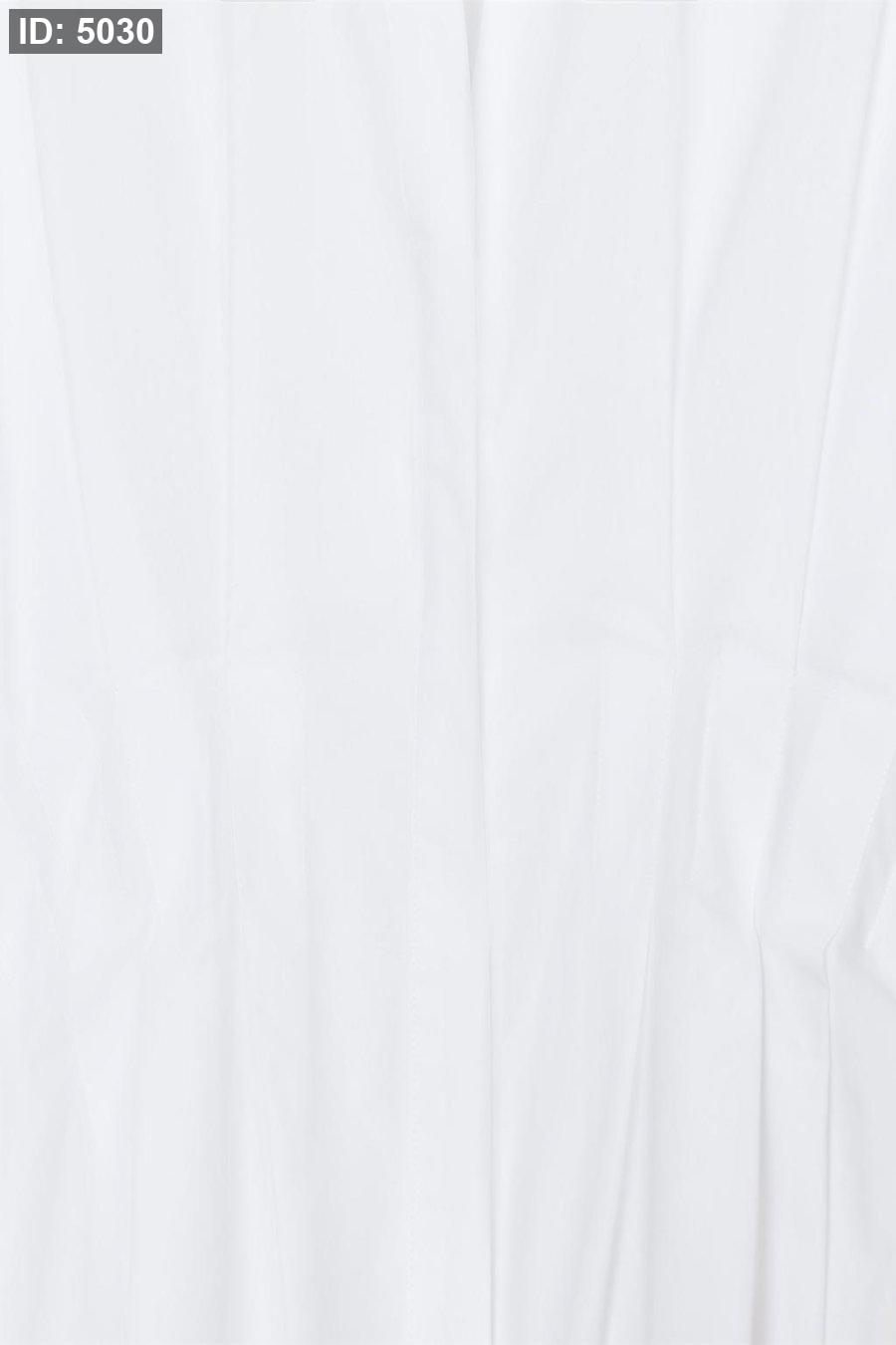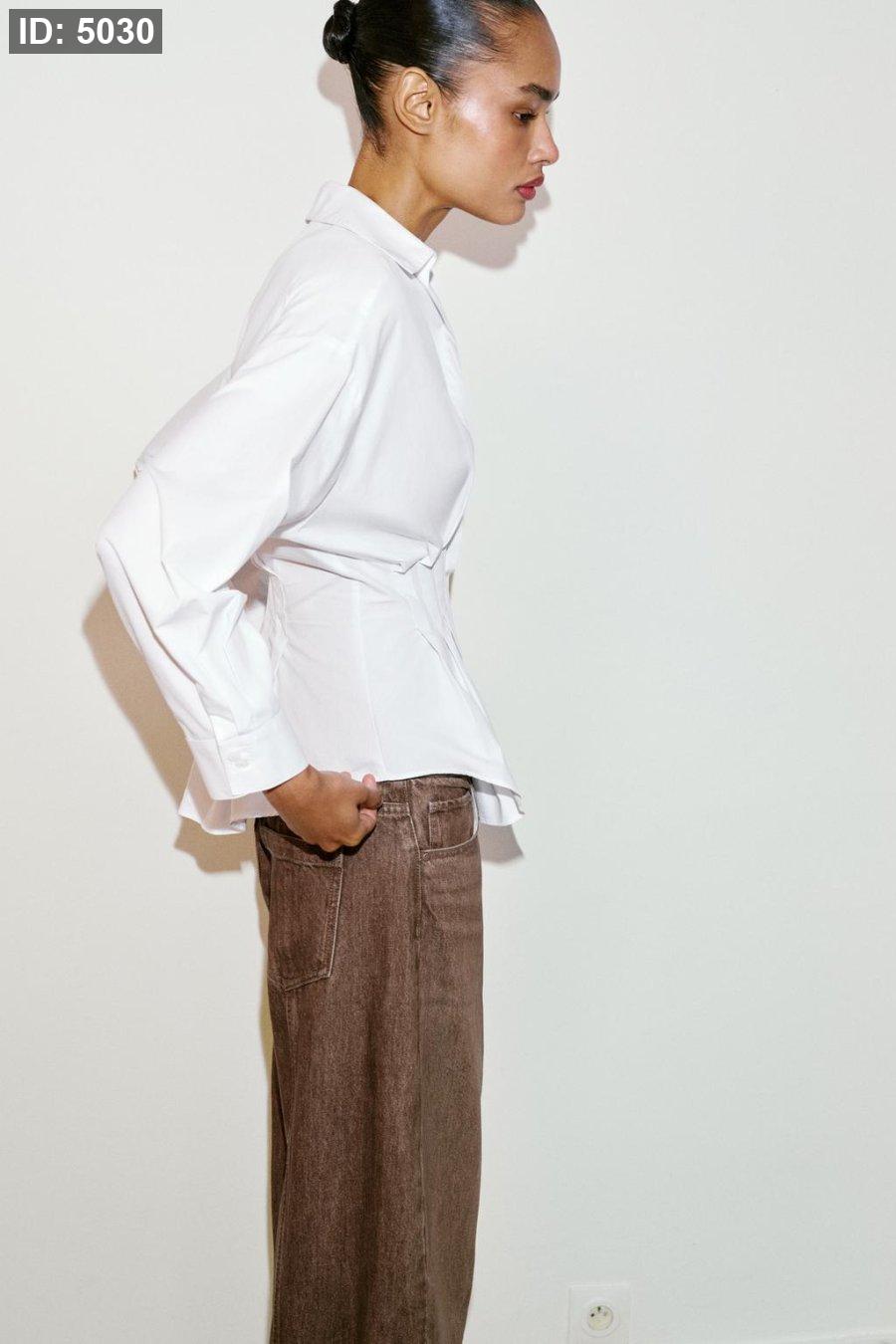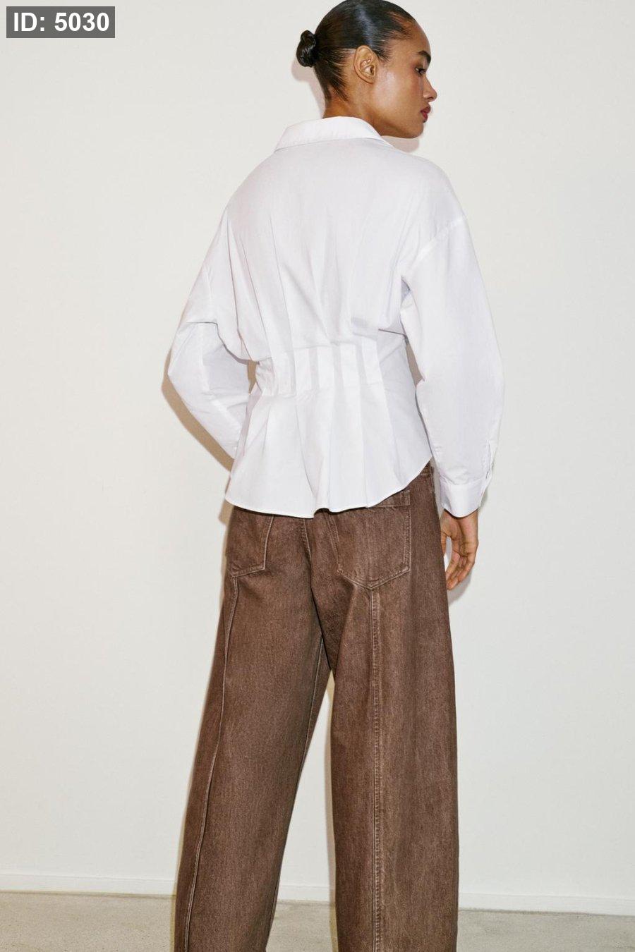 Collared shirt with a v-neck and long sleeve. Featuring pleats at the waist. Hidden button-up front.