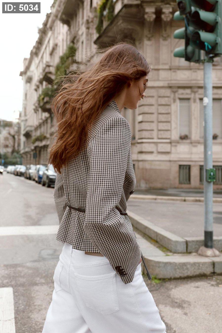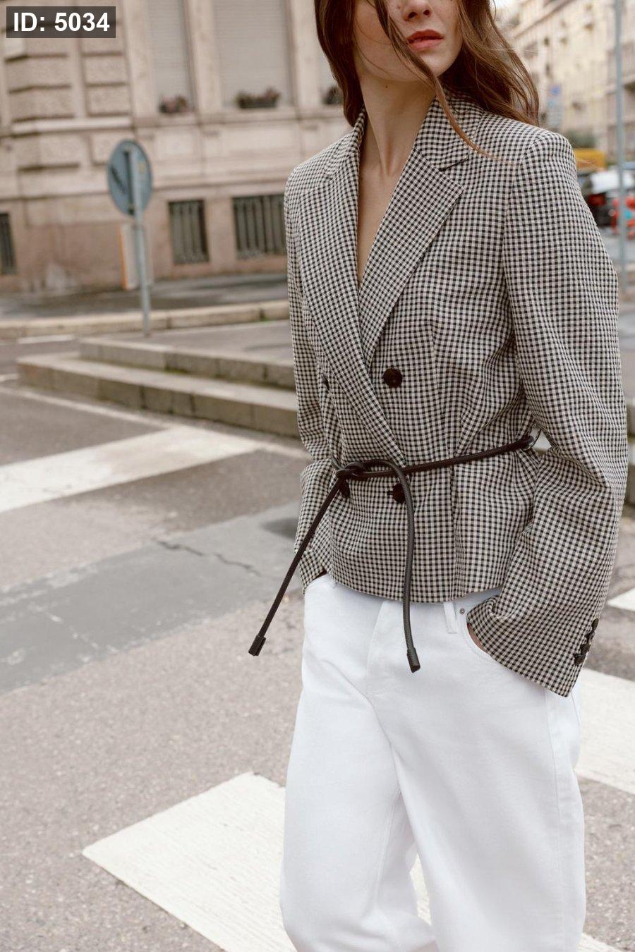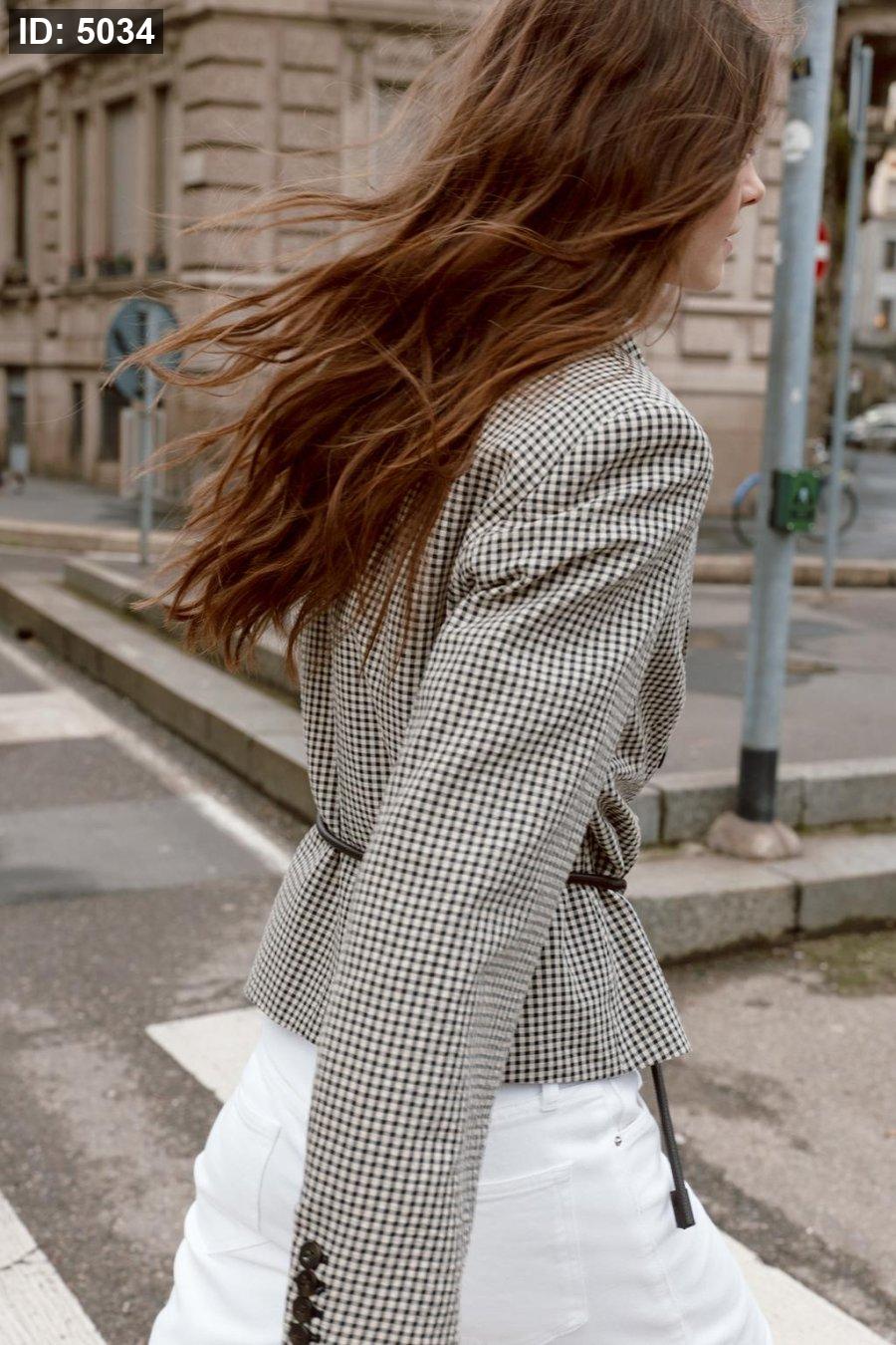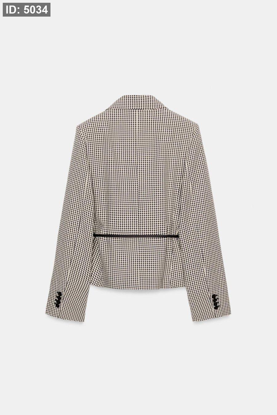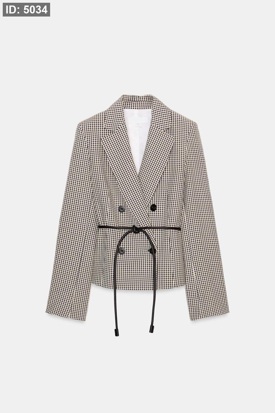 Cropped blazer with a lapel collar and long sleeves with shoulder pads. Front double-breasted button fastening with a thin belt.
