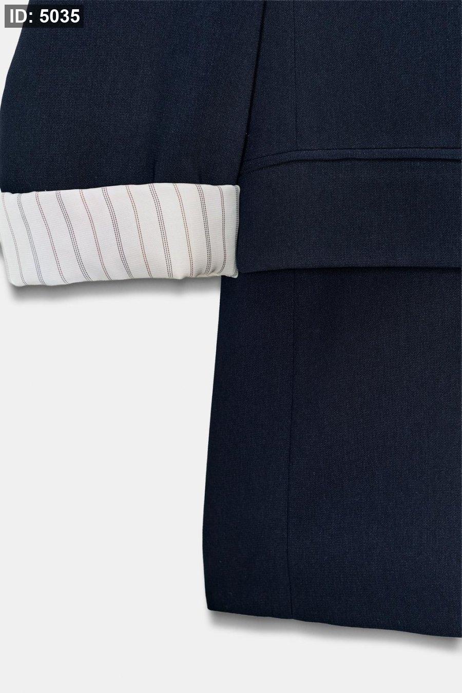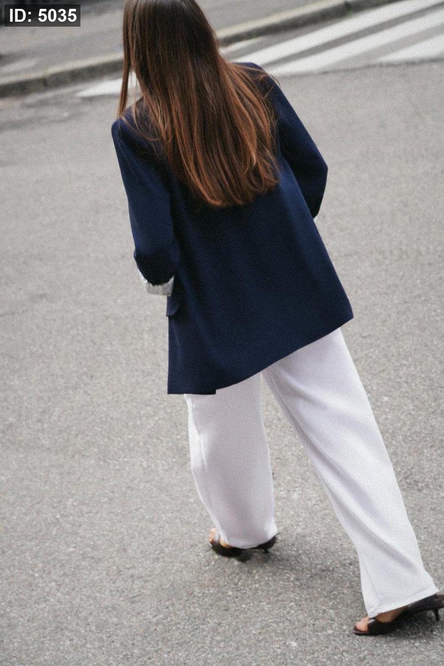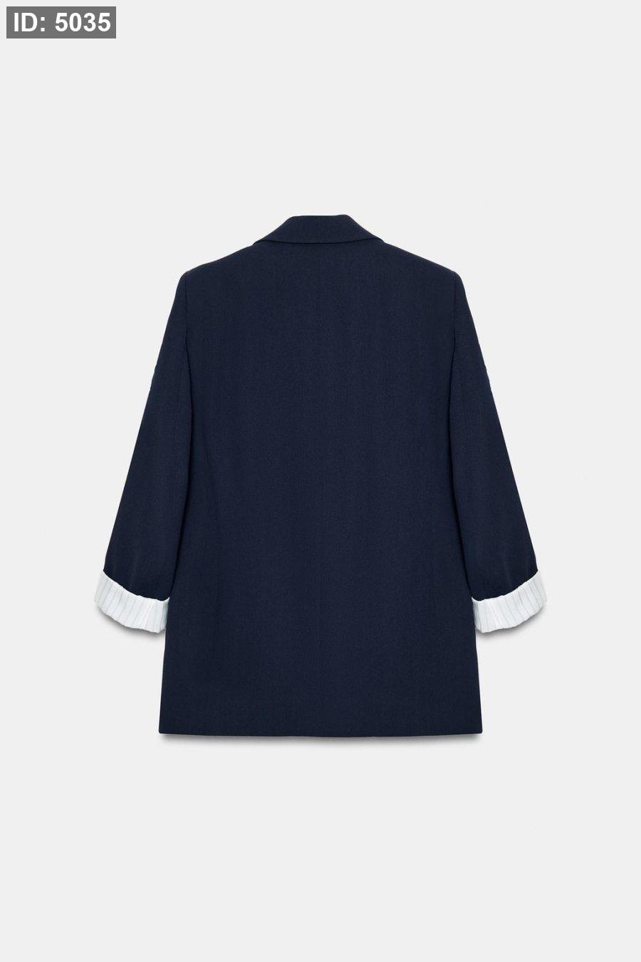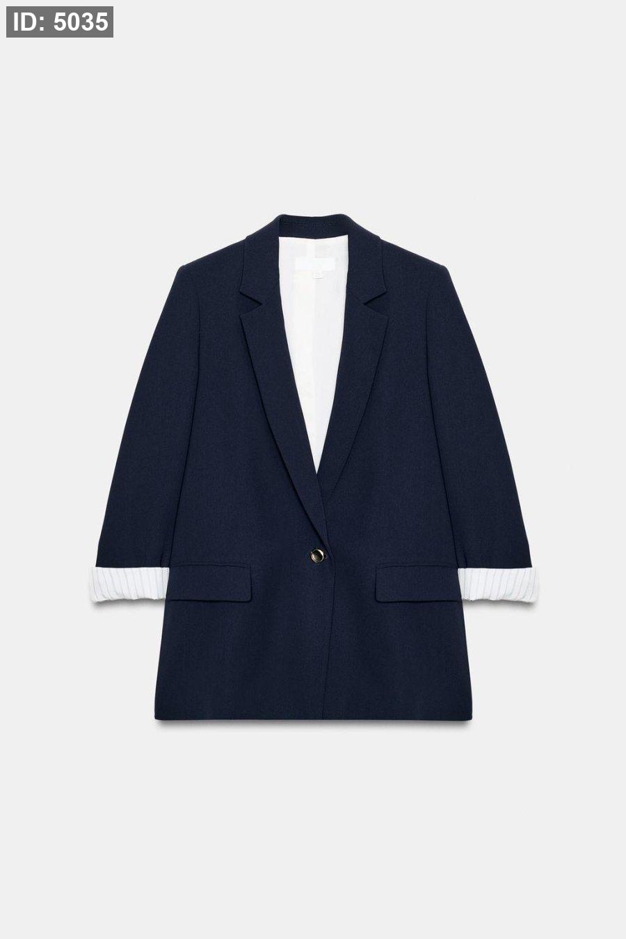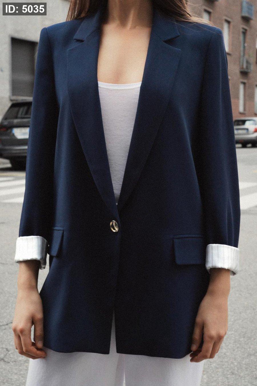 Blazer with a lapel collar, long sleeves with shoulder pads, finished with a turn-up and a combined cuff. Featuring front flap pockets and a gold button fastening on the front.