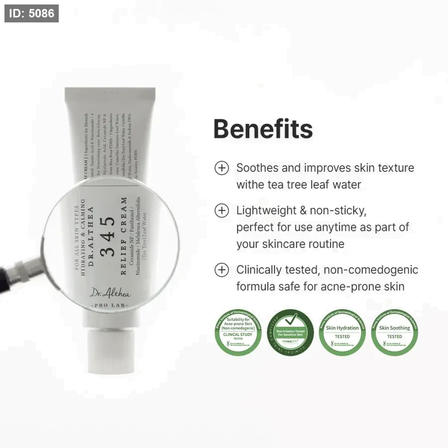 تم اختباره سريريًا على أنه غير كوميدوغينيك، كريم 345 ريليف (الإصدار 2) آمن ولطيف على البشرة المعرضة لحب الشباب، مما يجعله مثاليًا للاستخدام اليومي في روتين العناية بحب الشباب.
