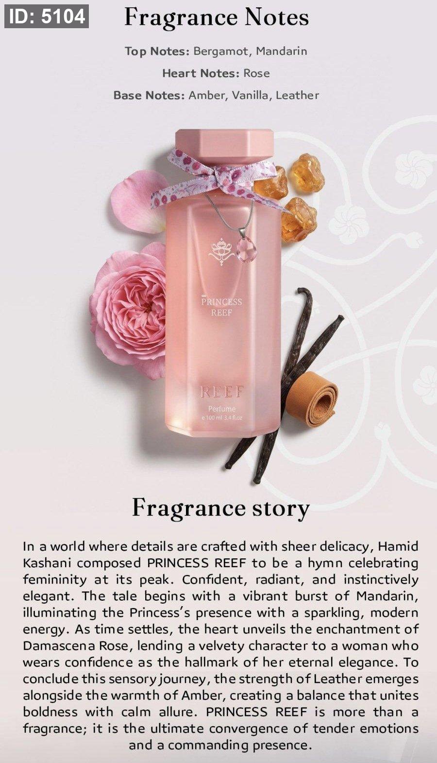 energy. As time settles, the heart unveils the enchantment of Damascena Rose, lending a velvety character to a woman who wears confidence as the hallmark of her eternal elegance. To conclude this sensory journey, the strength of Leather emerges alongside the warmth of Amber, creating a balance that unites boldness with calm allure. PRINCESS REEF is more than a fragrance; it is the ultimate convergence of tender emotions and a commanding presence.